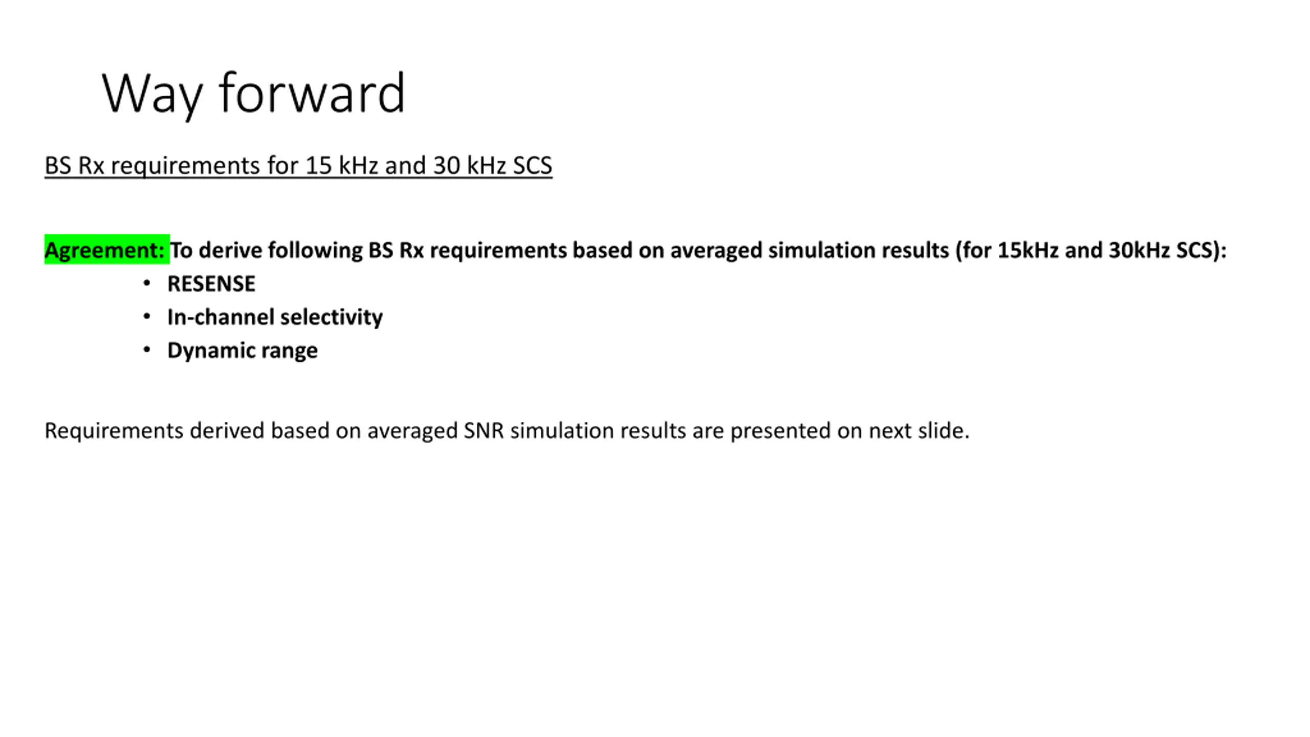 Way forward BS Rx requirements for 15 kHz and 30 kHz SCS Agreement: To derive following BS Rx requirements based on averaged simulation results (for 15kHz and 30kHz SCS): RESENSE In-channel selectivity Dynamic range Requirements derived based on averaged SNR simulation results are presented on next slide.