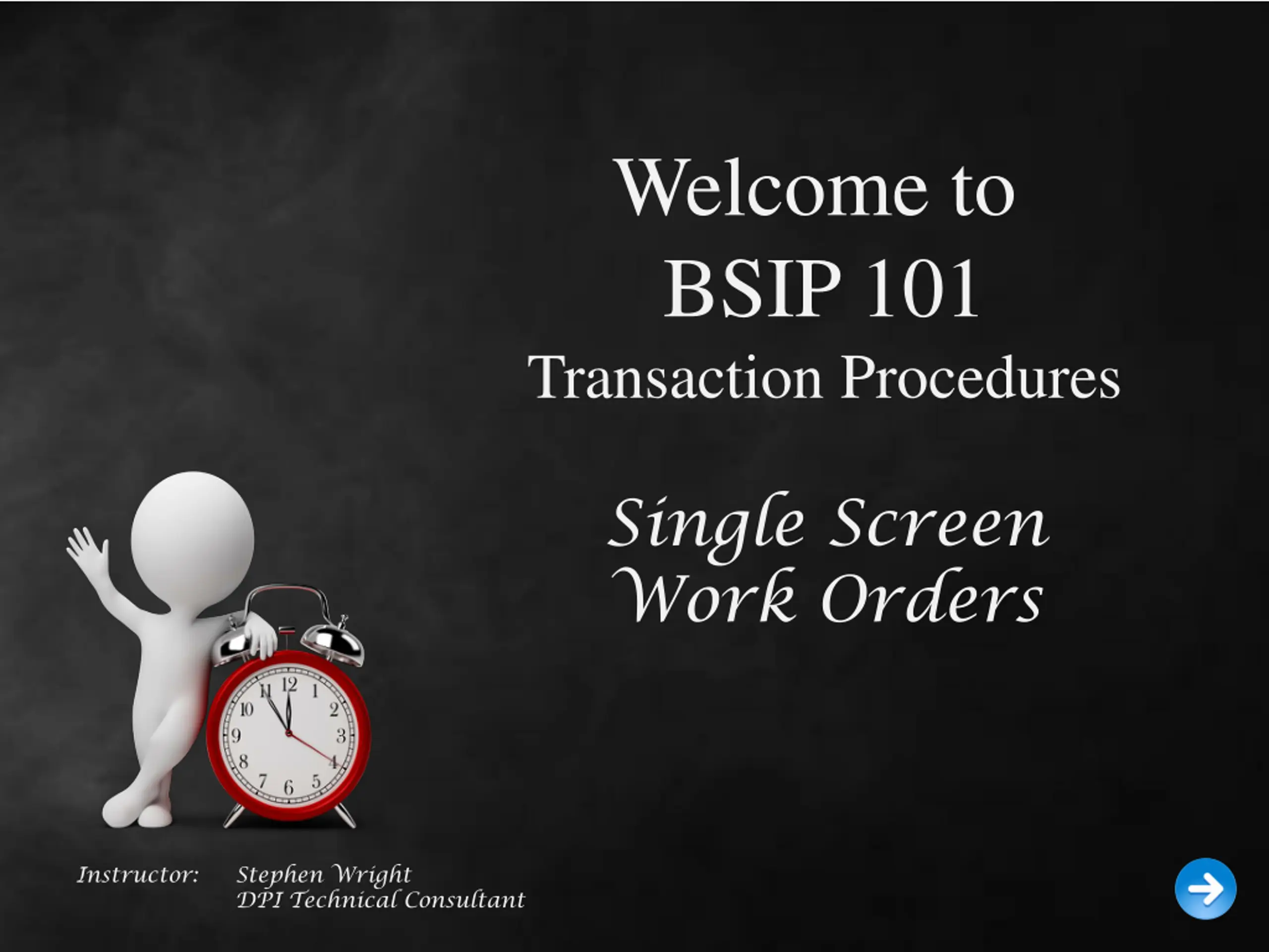 Welcome to BSIP 101 Transaction Procedures Single Screen Work Orders Instructor: Stephen Wright DPI Technical Consultant