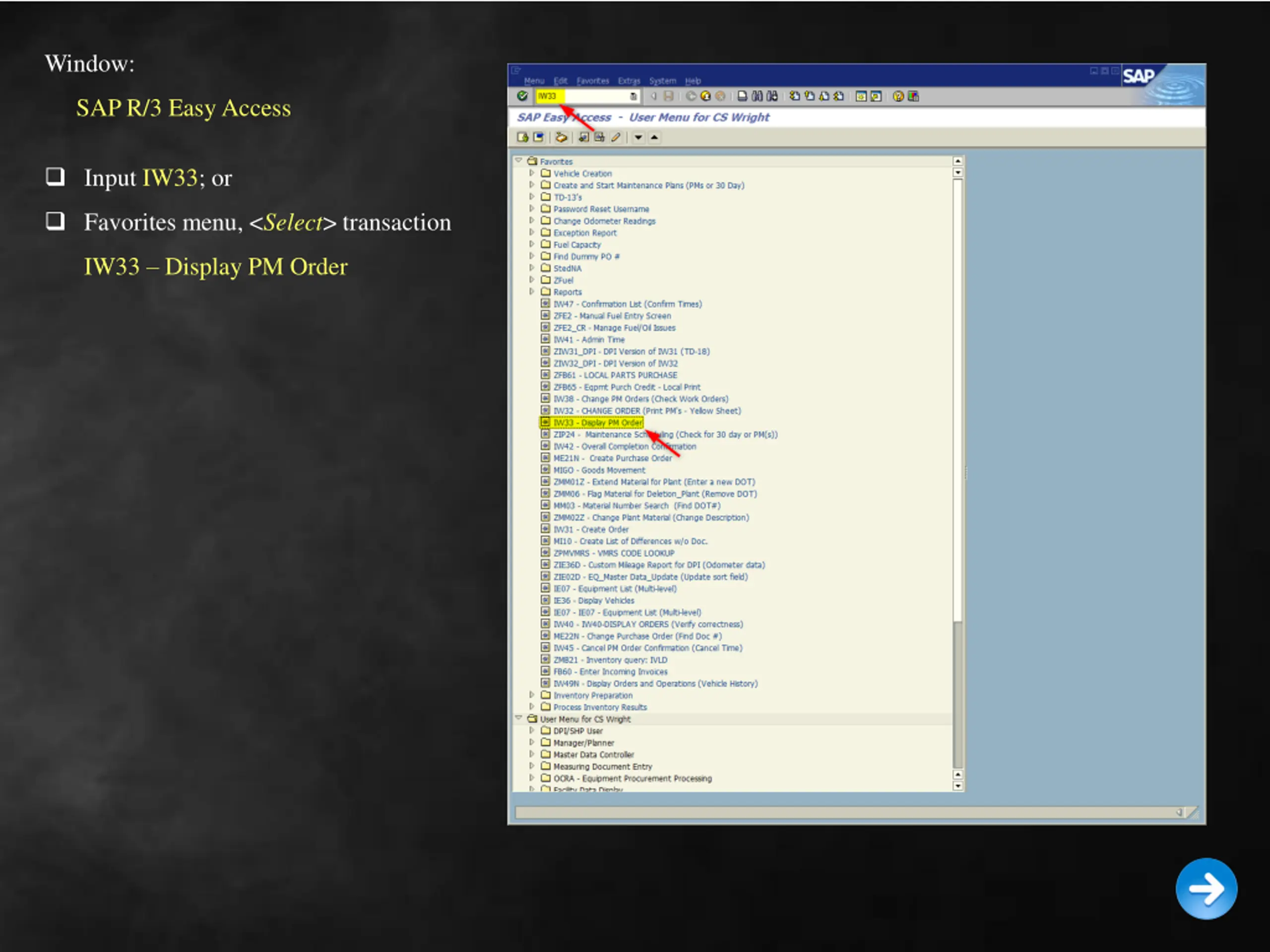 Window: SAP R/3 Easy Access Input IW33; or Favorites menu, <Select> transaction IW33 Display PM Order