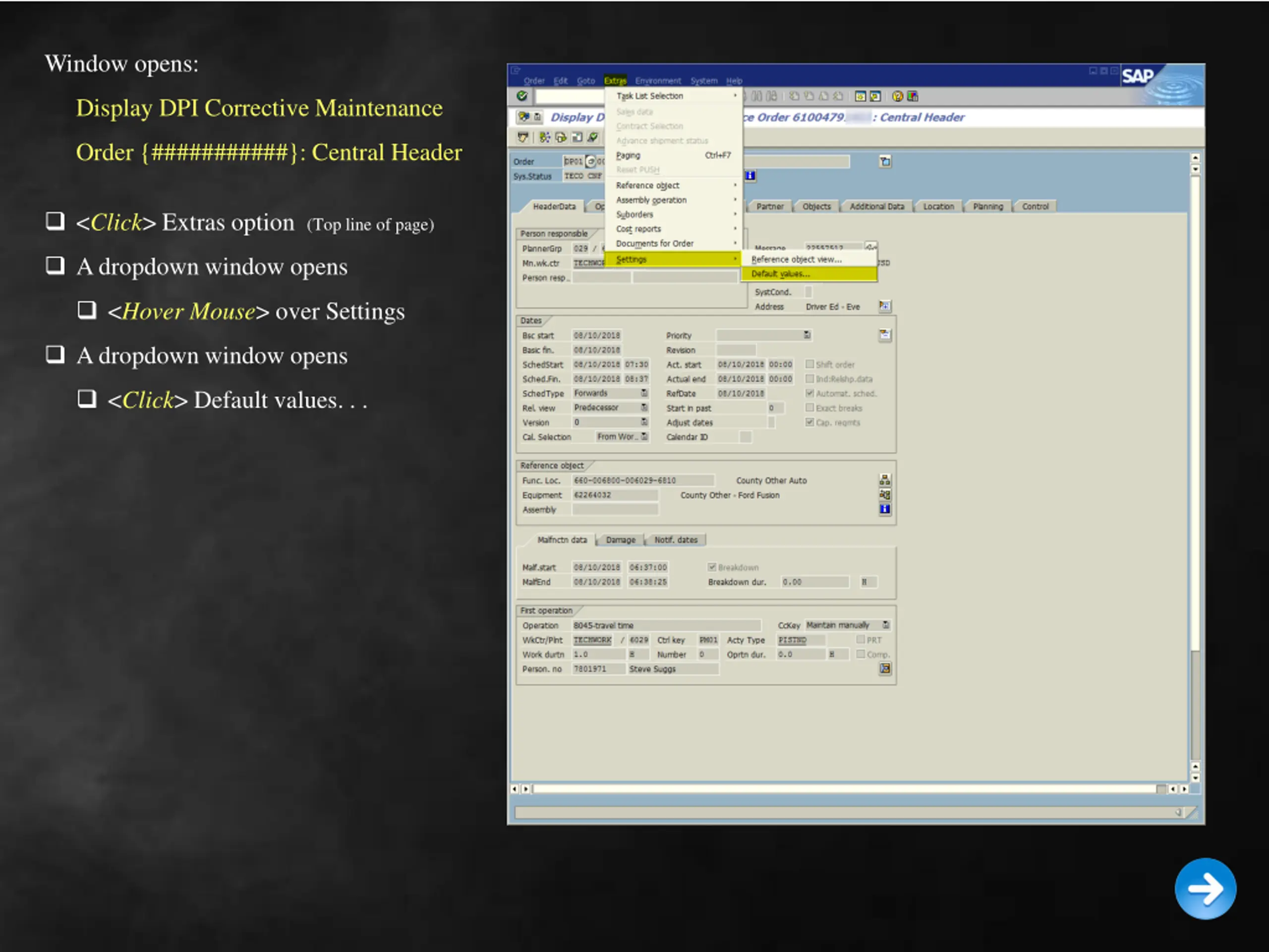 Window opens: Display DPI Corrective Maintenance Order {###########}: Central Header <Click> Extras option (Top line of page) A dropdown window opens <Hover Mouse> over Settings A dropdown window opens <Click> Default values. . .