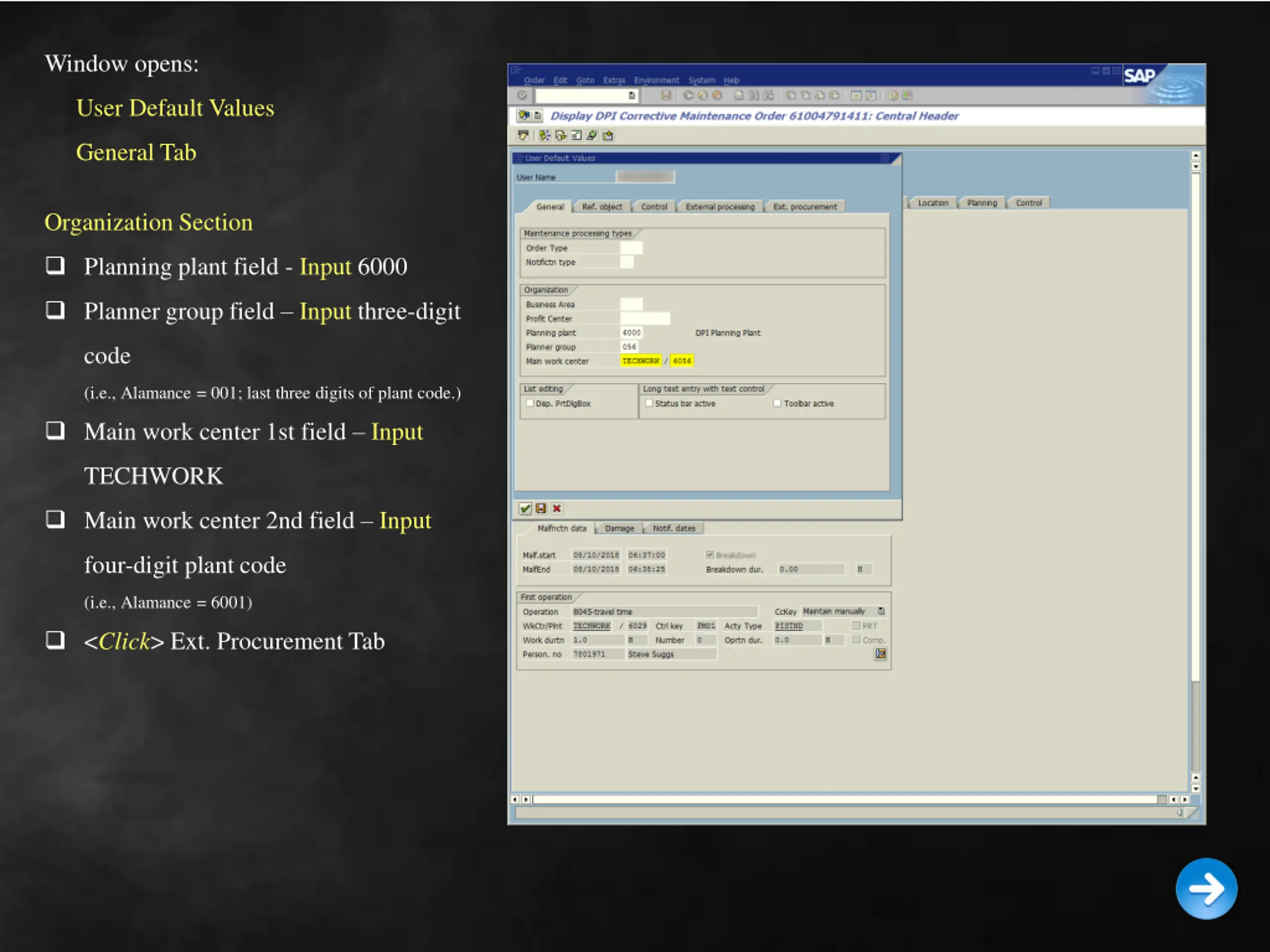 Window opens: User Default Values General Tab Organization Section Planning plant field - Input 6000 Planner group field Input three-digit code (i.e., Alamance = 001; last three digits of plant code.) Main work center 1st field Input TECHWORK Main work center 2nd field Input four-digit plant code (i.e., Alamance = 6001) <Click> Ext. Procurement Tab