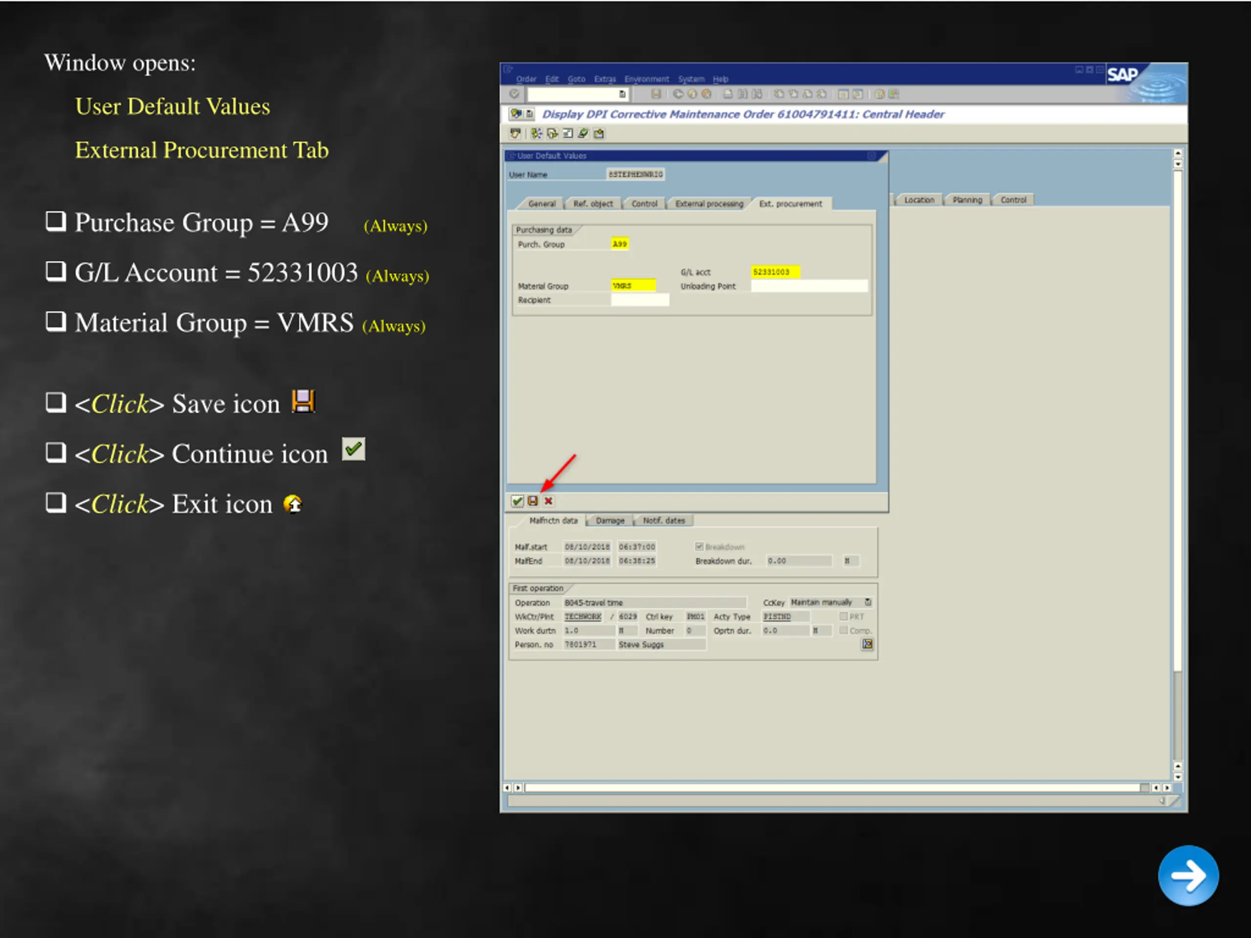 Window opens: User Default Values External Procurement Tab Purchase Group = A99 (Always) G/L Account = 52331003 (Always) Material Group = VMRS (Always) <Click> Save icon <Click> Continue icon <Click> Exit icon