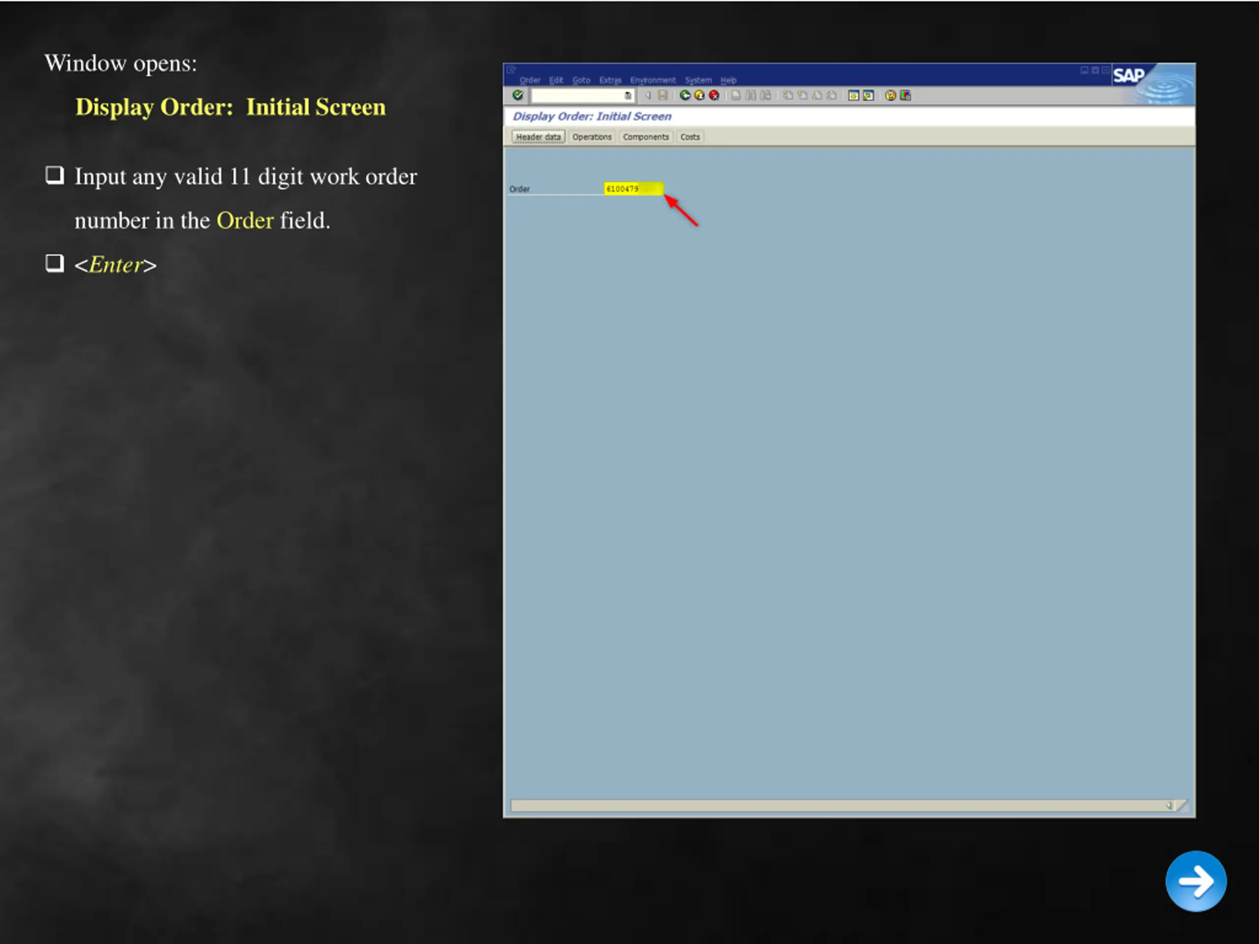 Window opens: Display Order: Initial Screen Input any valid 11 digit work order number in the Order field. <Enter>