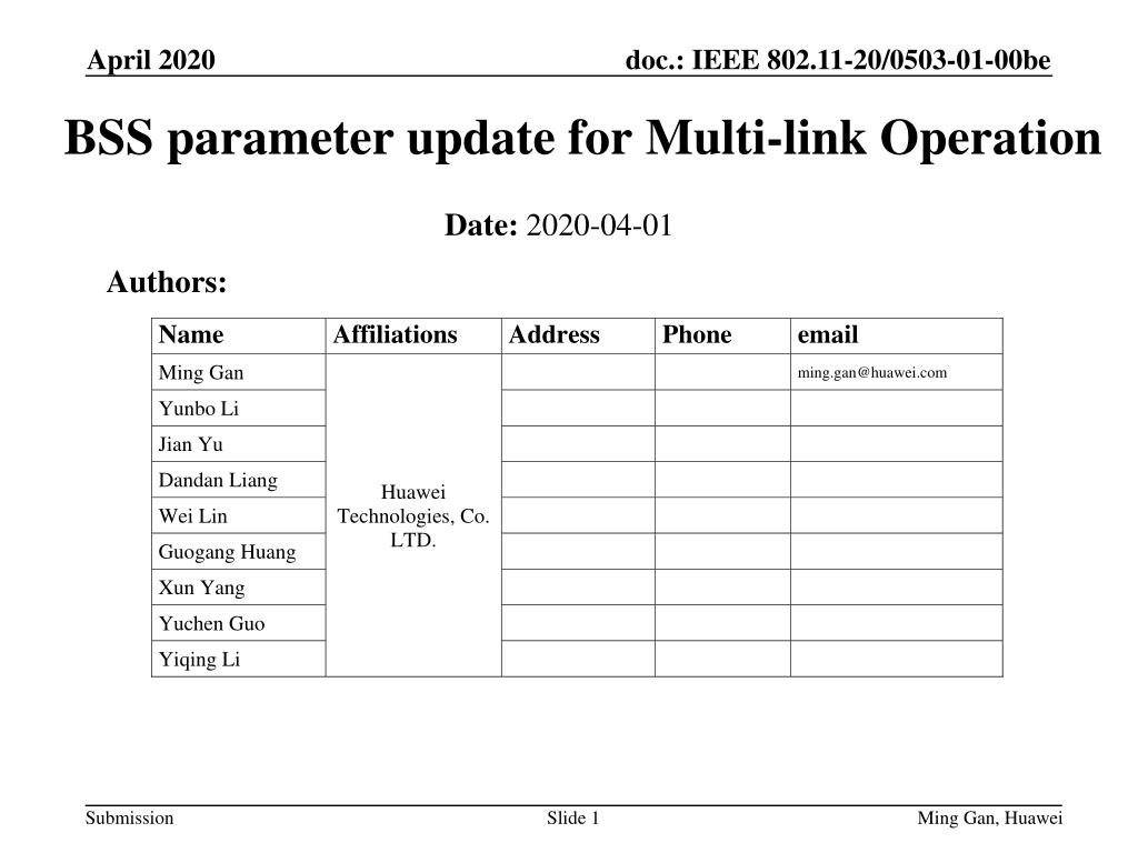 April 2020 doc.: IEEE 802.11-20/0503-01-00be BSS parameter update for Multi-link Operation Date: 2020-04-01 Authors: Name Affiliations Address Phone email Ming Gan ming.gan@huawei.com Yunbo Li Jian Yu Dandan Liang Huawei Wei Lin Technologies, Co. LTD. Guogang Huang Xun Yang Yuchen Guo Yiqing Li Submission Slide 1 Ming Gan, Huawei