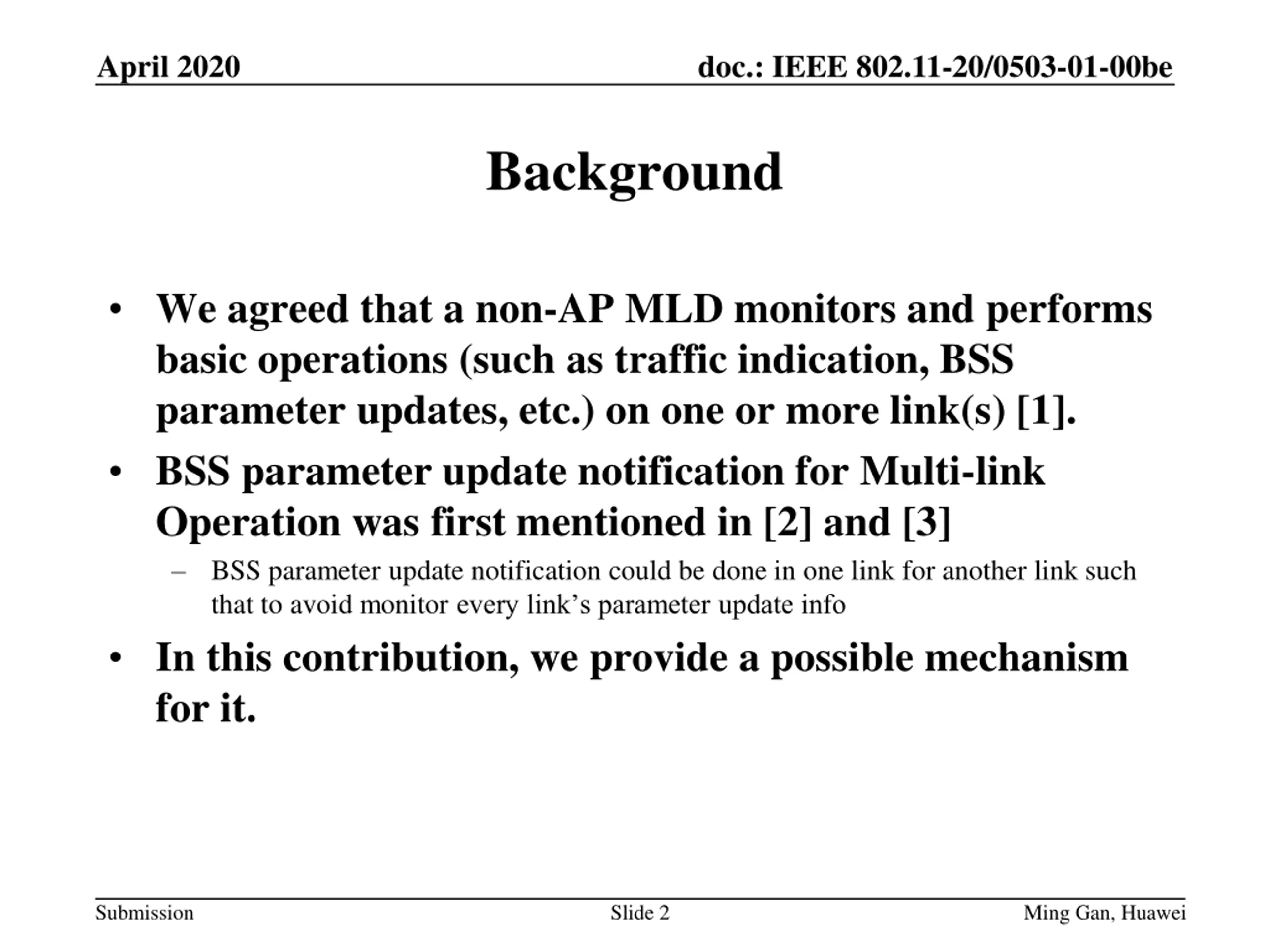 April 2020 doc.: IEEE 802.11-20/0503-01-00be Background We agreed that a non-AP MLD monitors and performs basic operations (such as traffic indication, BSS parameter updates, etc.) on one or more link(s) [1]. BSS parameter update notification for Multi-link Operation was first mentioned in [2] and [3] BSS parameter update notification could be done in one link for another link such that to avoid monitor every link s parameter update info In this contribution, we provide a possible mechanism for it. Submission Slide 2 Ming Gan, Huawei