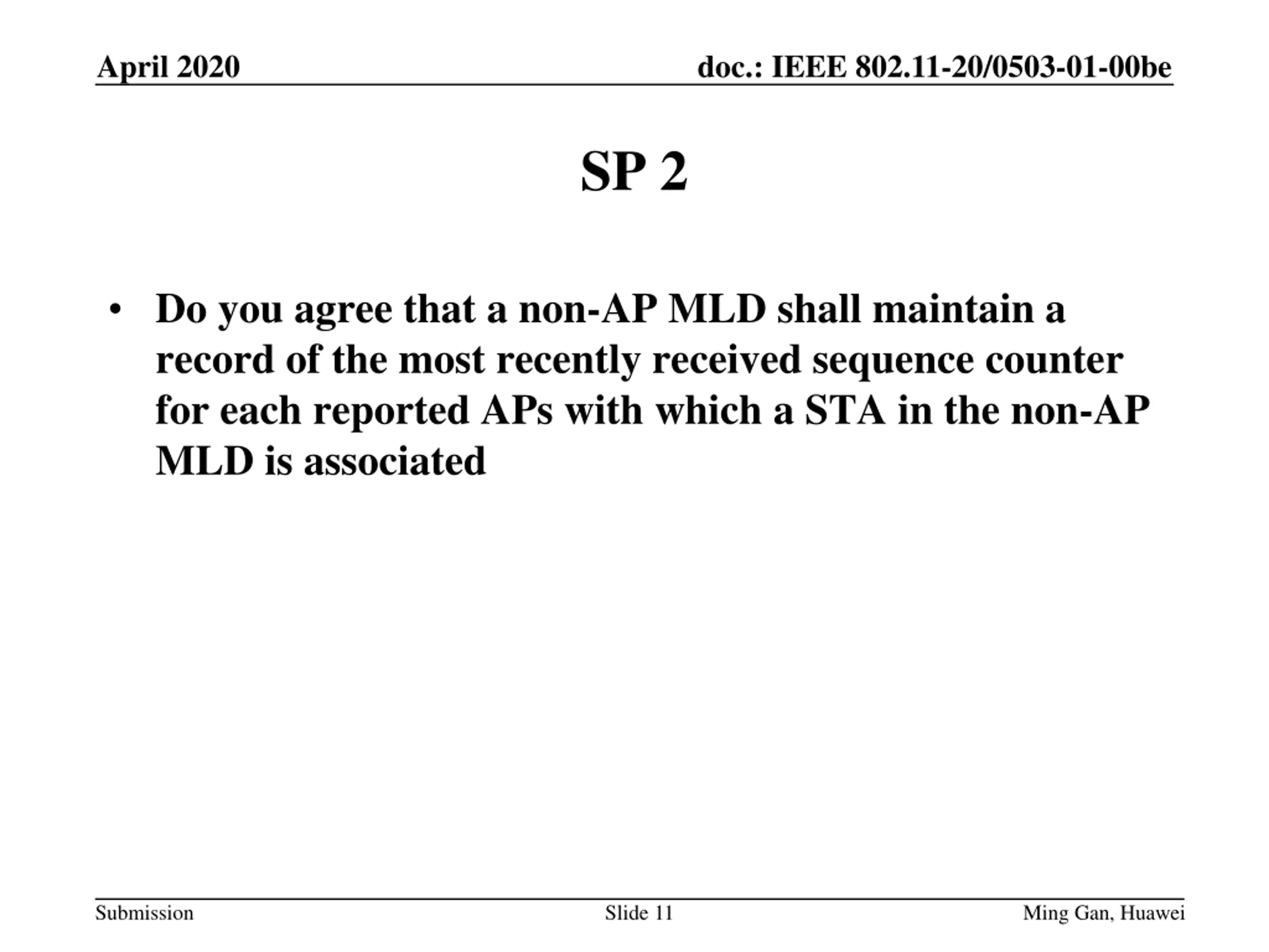 April 2020 doc.: IEEE 802.11-20/0503-01-00be SP 2 Do you agree that a non-AP MLD shall maintain a record of the most recently received sequence counter for each reported APs with which a STA in the non-AP MLD is associated Submission Slide 11 Ming Gan, Huawei
