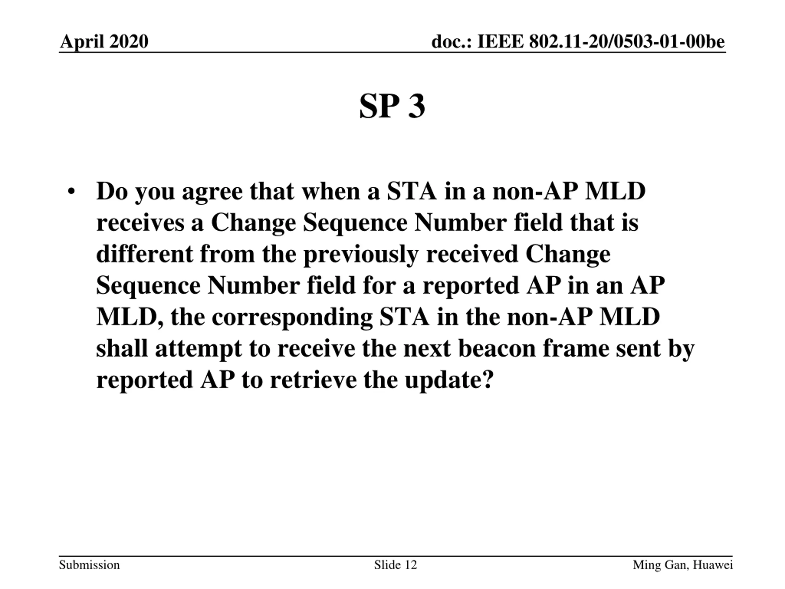 April 2020 doc.: IEEE 802.11-20/0503-01-00be SP 3 Do you agree that when a STA in a non-AP MLD receives a Change Sequence Number field that is different from the previously received Change Sequence Number field for a reported AP in an AP MLD, the corresponding STA in the non-AP MLD shall attempt to receive the next beacon frame sent by reported AP to retrieve the update? Submission Slide 12 Ming Gan, Huawei