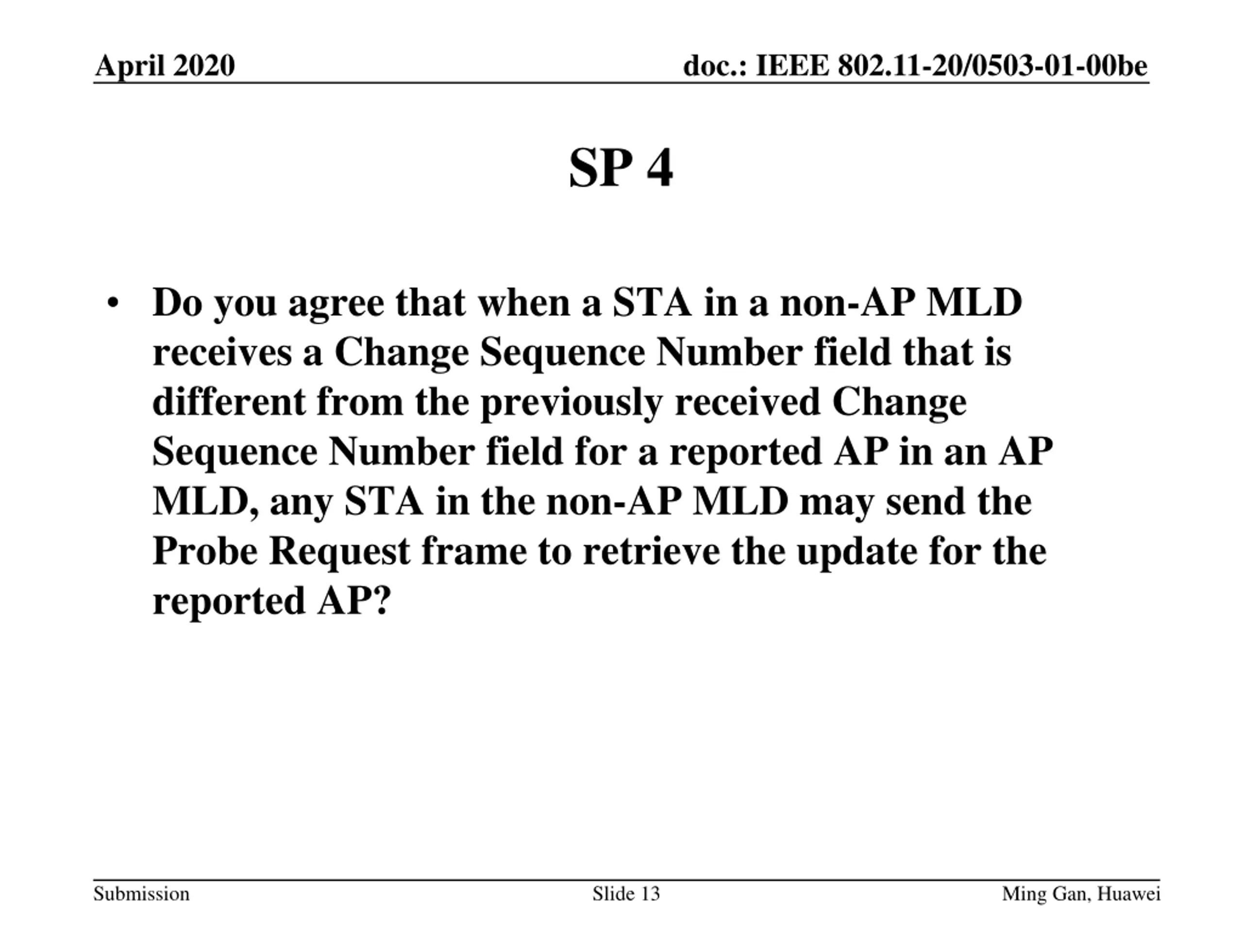 April 2020 doc.: IEEE 802.11-20/0503-01-00be SP 4 Do you agree that when a STA in a non-AP MLD receives a Change Sequence Number field that is different from the previously received Change Sequence Number field for a reported AP in an AP MLD, any STA in the non-AP MLD may send the Probe Request frame to retrieve the update for the reported AP? Submission Slide 13 Ming Gan, Huawei