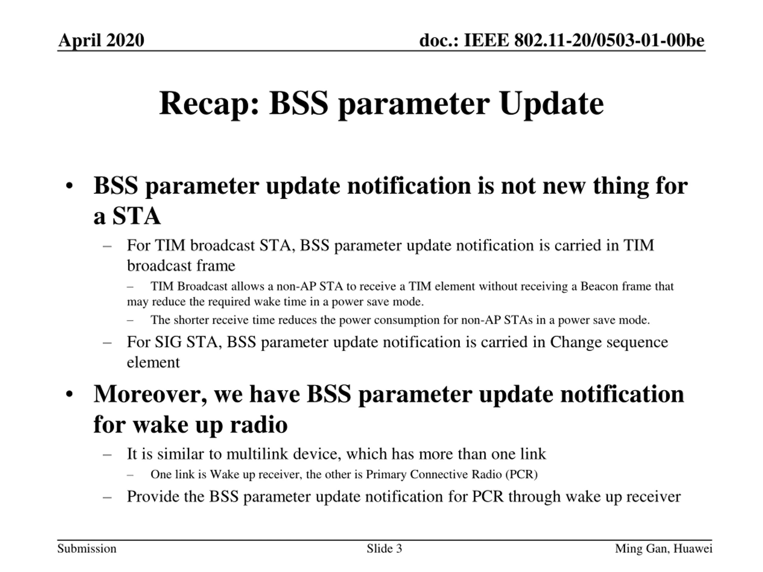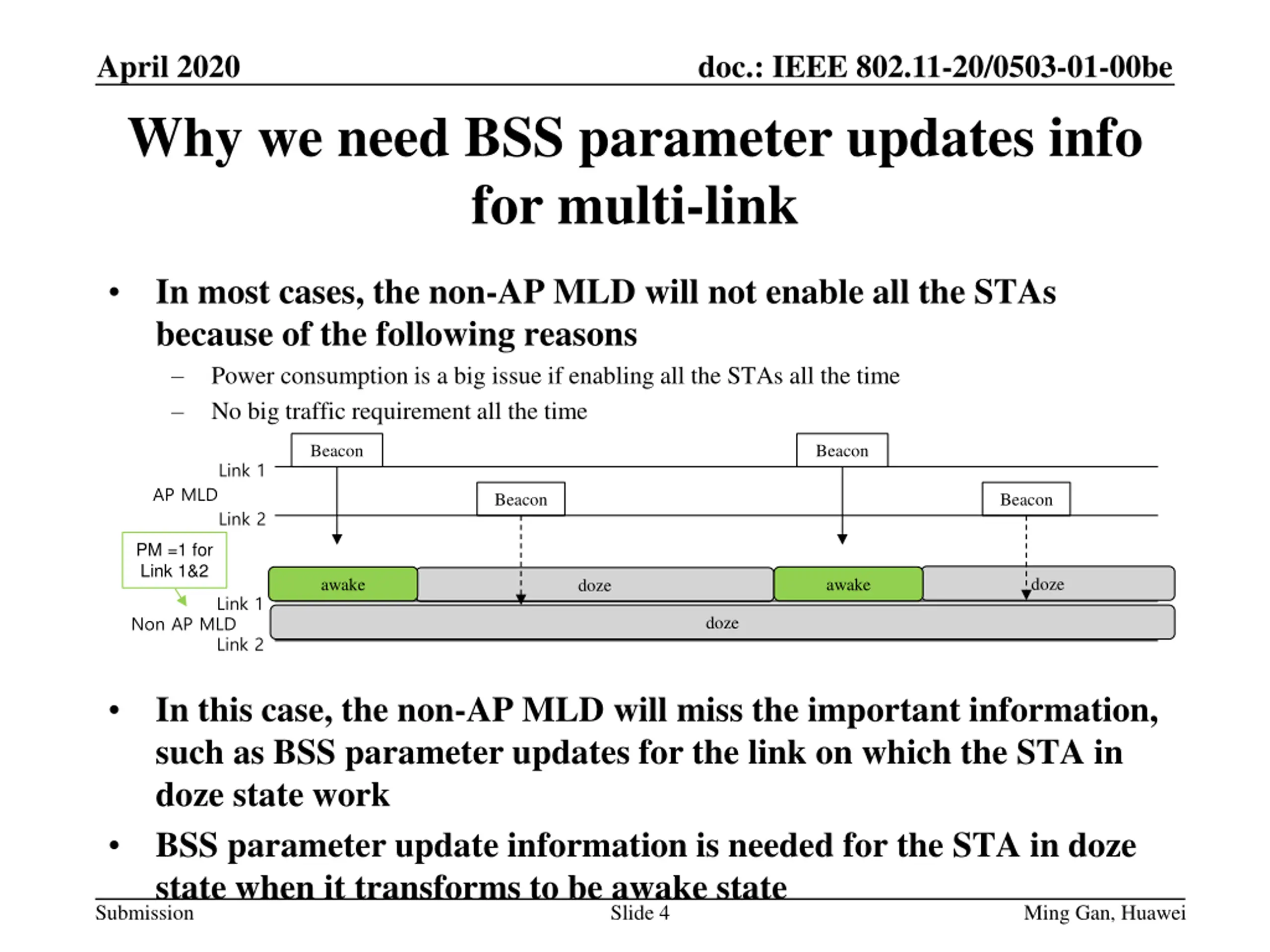 April 2020 doc.: IEEE 802.11-20/0503-01-00be Recap: BSS parameter Update BSS parameter update notification is not new thing for a STA For TIM broadcast STA, BSS parameter update notification is carried in TIM broadcast frame TIM Broadcast allows a non-AP STA to receive a TIM element without receiving a Beacon frame that may reduce the required wake time in a power save mode. The shorter receive time reduces the power consumption for non-AP STAs in a power save mode. For SIG STA, BSS parameter update notification is carried in Change sequence element Moreover, we have BSS parameter update notification for wake up radio It is similar to multilink device, which has more than one link One link is Wake up receiver, the other is Primary Connective Radio (PCR) Provide the BSS parameter update notification for PCR through wake up receiver Submission Slide 3 Ming Gan, Huawei