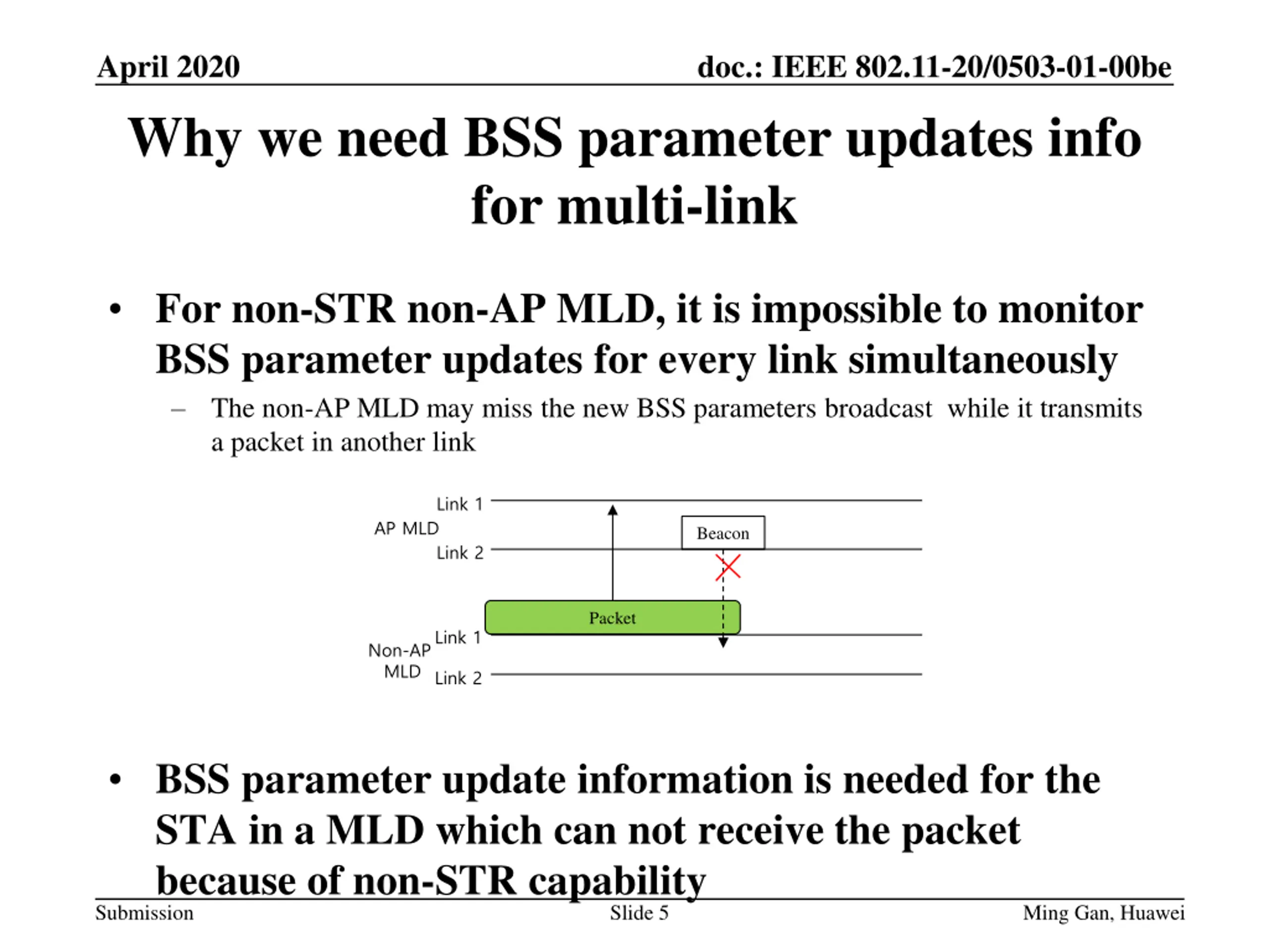 April 2020 doc.: IEEE 802.11-20/0503-01-00be Why we need BSS parameter updates info for multi-link In most cases, the non-AP MLD will not enable all the STAs because of the following reasons Power consumption is a big issue if enabling all the STAs all the time No big traffic requirement all the time Beacon Beacon Link 1 AP MLD Beacon Beacon Link 2 PM =1 for Link 1&2 doze awake awake doze Link 1 Non AP MLD doze Link 2 In this case, the non-AP MLD will miss the important information, such as BSS parameter updates for the link on which the STA in doze state work BSS parameter update information is needed for the STA in doze state when it transforms to be awake state Slide 4 Submission Ming Gan, Huawei