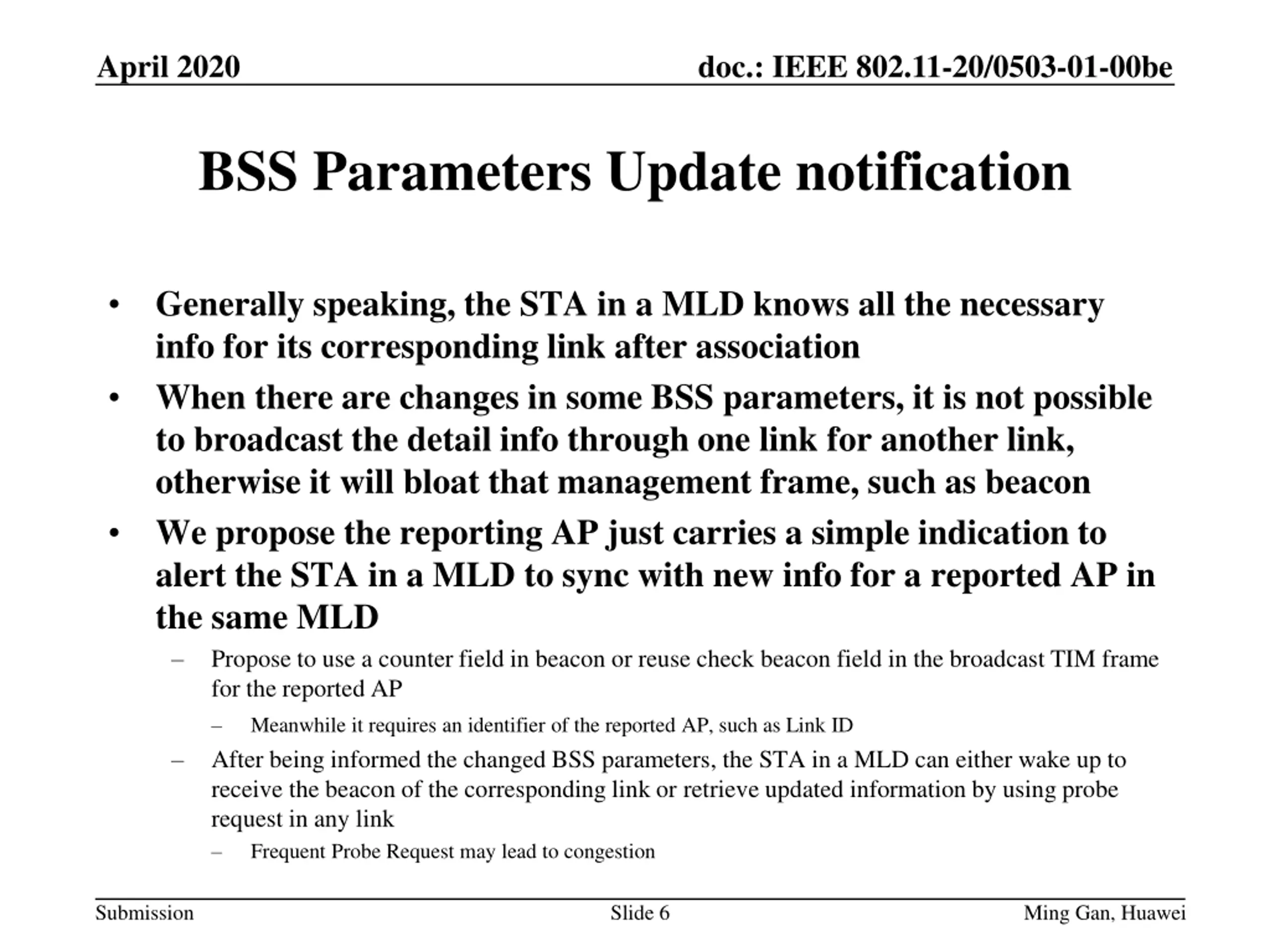 April 2020 doc.: IEEE 802.11-20/0503-01-00be Why we need BSS parameter updates info for multi-link For non-STR non-AP MLD, it is impossible to monitor BSS parameter updates for every link simultaneously The non-AP MLD may miss the new BSS parameters broadcast while it transmits a packet in another link Link 1 AP MLD Beacon Link 2 Packet Link 1 Non-AP MLD Link 2 BSS parameter update information is needed for the STA in a MLD which can not receive the packet because of non-STR capability Submission Slide 5 Ming Gan, Huawei