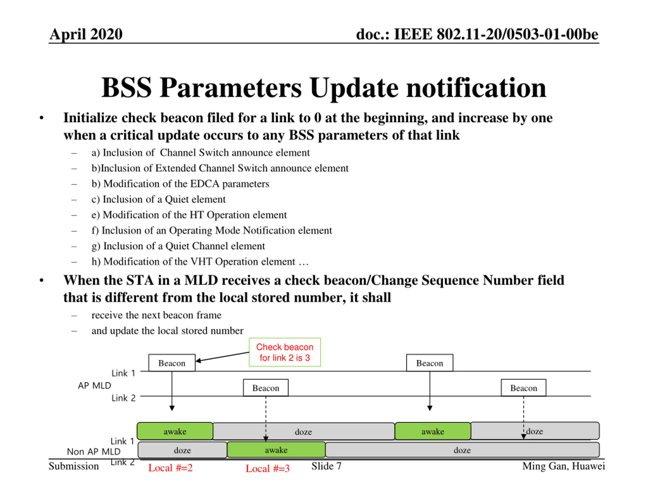 April 2020 doc.: IEEE 802.11-20/0503-01-00be BSS Parameters Update notification Initialize check beacon filed for a link to 0 at the beginning, and increase by one when a critical update occurs to any BSS parameters of that link a) Inclusion of Channel Switch announce element b)Inclusion of Extended Channel Switch announce element b) Modification of the EDCA parameters c) Inclusion of a Quiet element e) Modification of the HT Operation element f) Inclusion of an Operating Mode Notification element g) Inclusion of a Quiet Channel element h) Modification of the VHT Operation element When the STA in a MLD receives a check beacon/Change Sequence Number field that is different from the local stored number, it shall receive the next beacon frame and update the local stored number Check beacon for link 2 is 3 Beacon Beacon Link 1 AP MLD Beacon Beacon Link 2 doze awake awake doze Link 1 awake doze Non AP MLD doze Link 2 Submission Slide 7 Ming Gan, Huawei Local #=2 Local #=3