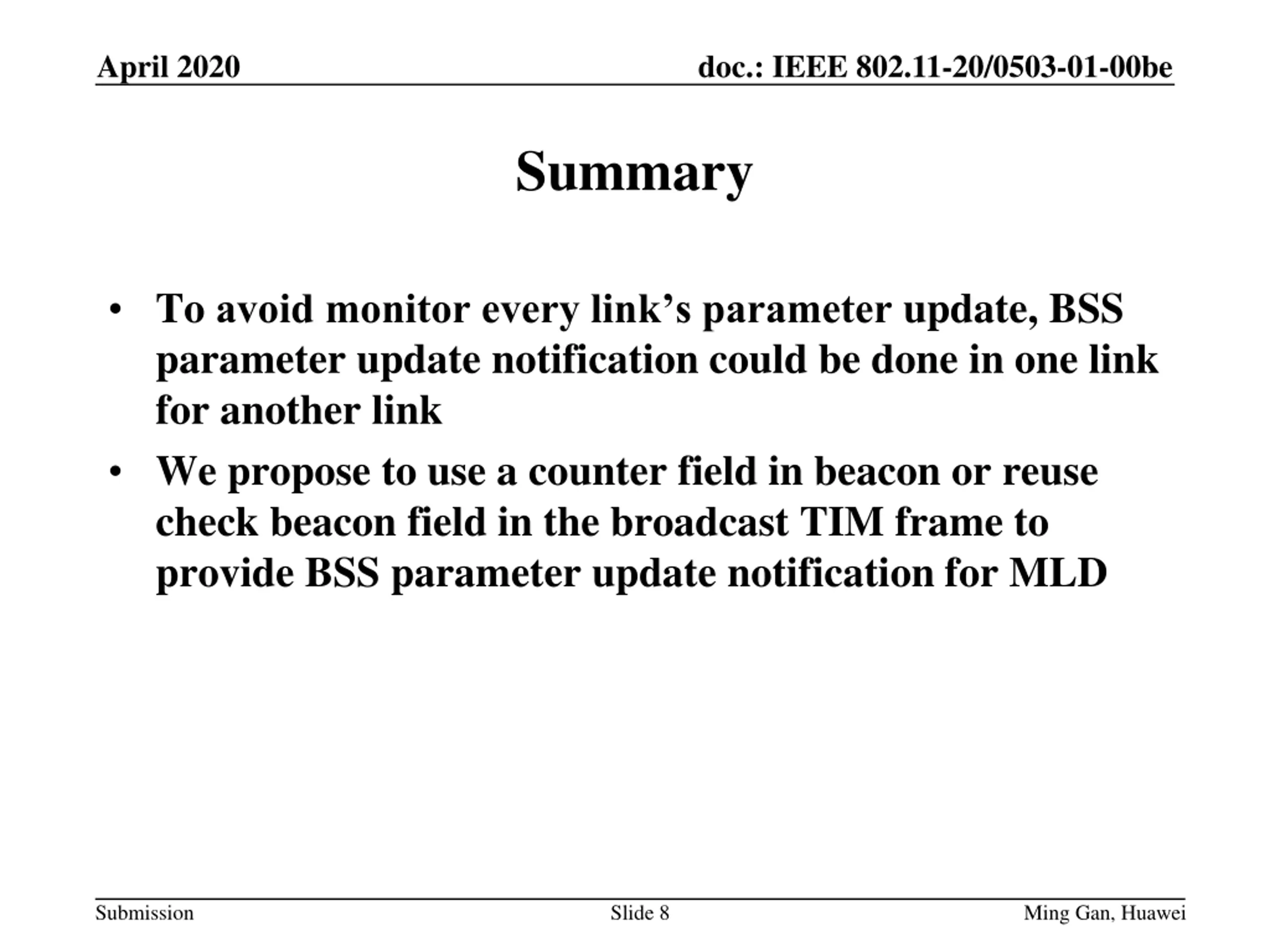 April 2020 doc.: IEEE 802.11-20/0503-01-00be Summary To avoid monitor every link s parameter update, BSS parameter update notification could be done in one link for another link We propose to use a counter field in beacon or reuse check beacon field in the broadcast TIM frame to provide BSS parameter update notification for MLD Submission Slide 8 Ming Gan, Huawei