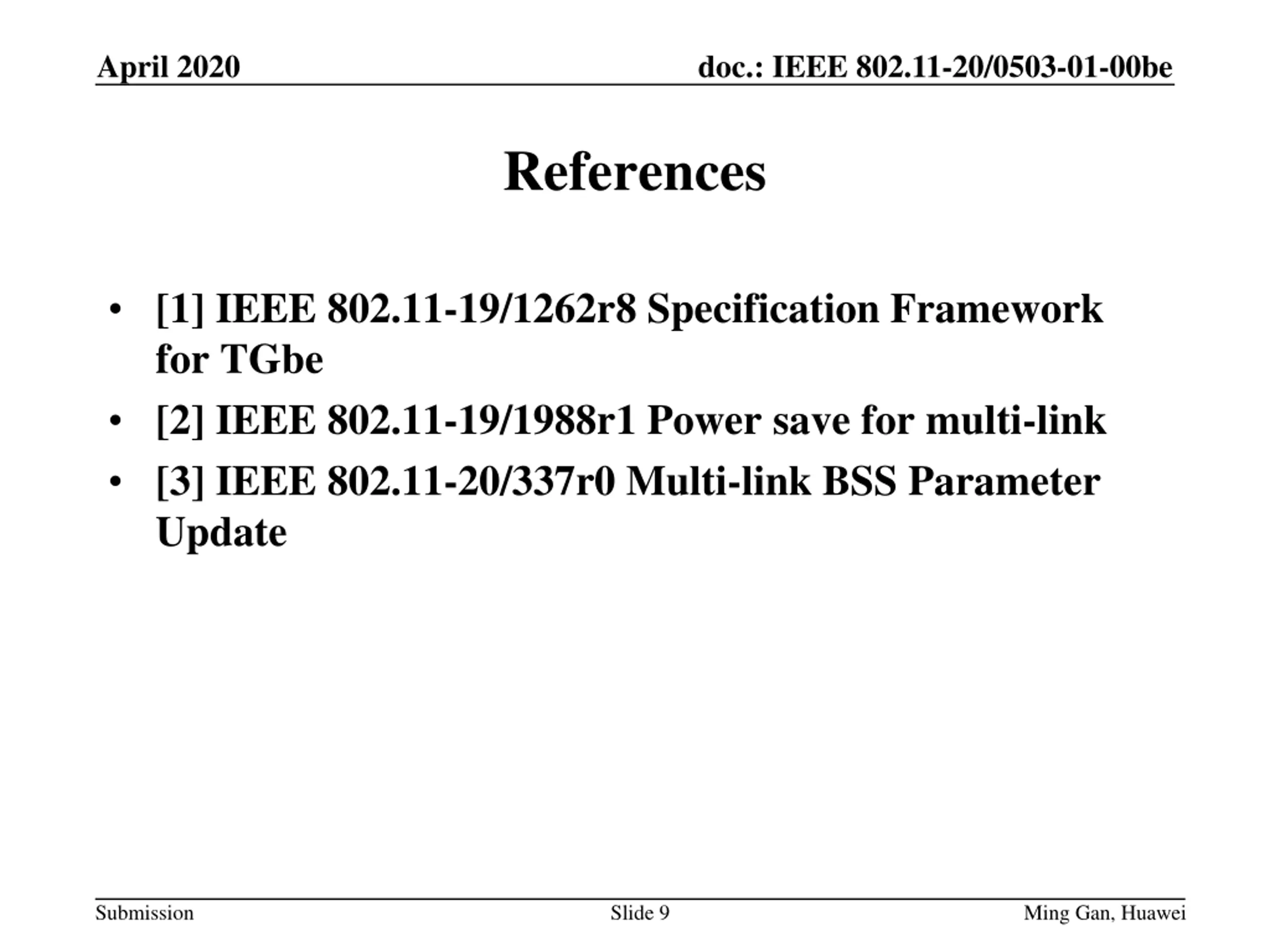 April 2020 doc.: IEEE 802.11-20/0503-01-00be References [1] IEEE 802.11-19/1262r8 Specification Framework for TGbe [2] IEEE 802.11-19/1988r1 Power save for multi-link [3] IEEE 802.11-20/337r0 Multi-link BSS Parameter Update Submission Slide 9 Ming Gan, Huawei
