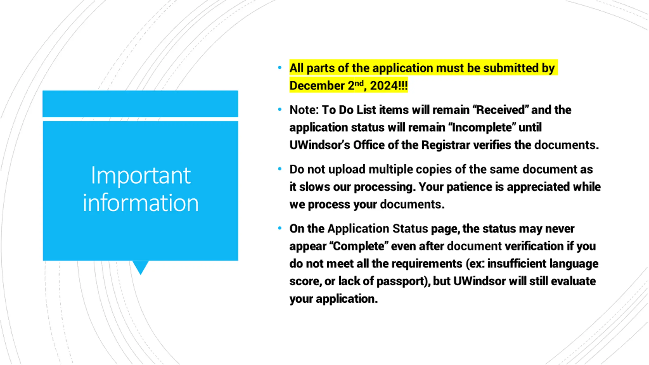 All parts of the application must be submitted by December 2nd, 2024!!! Note: To Do List items will remain Received and the application status will remain Incomplete until UWindsor s Office of the Registrar verifies the documents. Do not upload multiple copies of the same document as it slows our processing. Your patience is appreciated while we process your documents. Important information On the Application Status page, the status may never appear Complete even after document verification if you do not meet all the requirements (ex: insufficient language score, or lack of passport), but UWindsor will still evaluate your application.