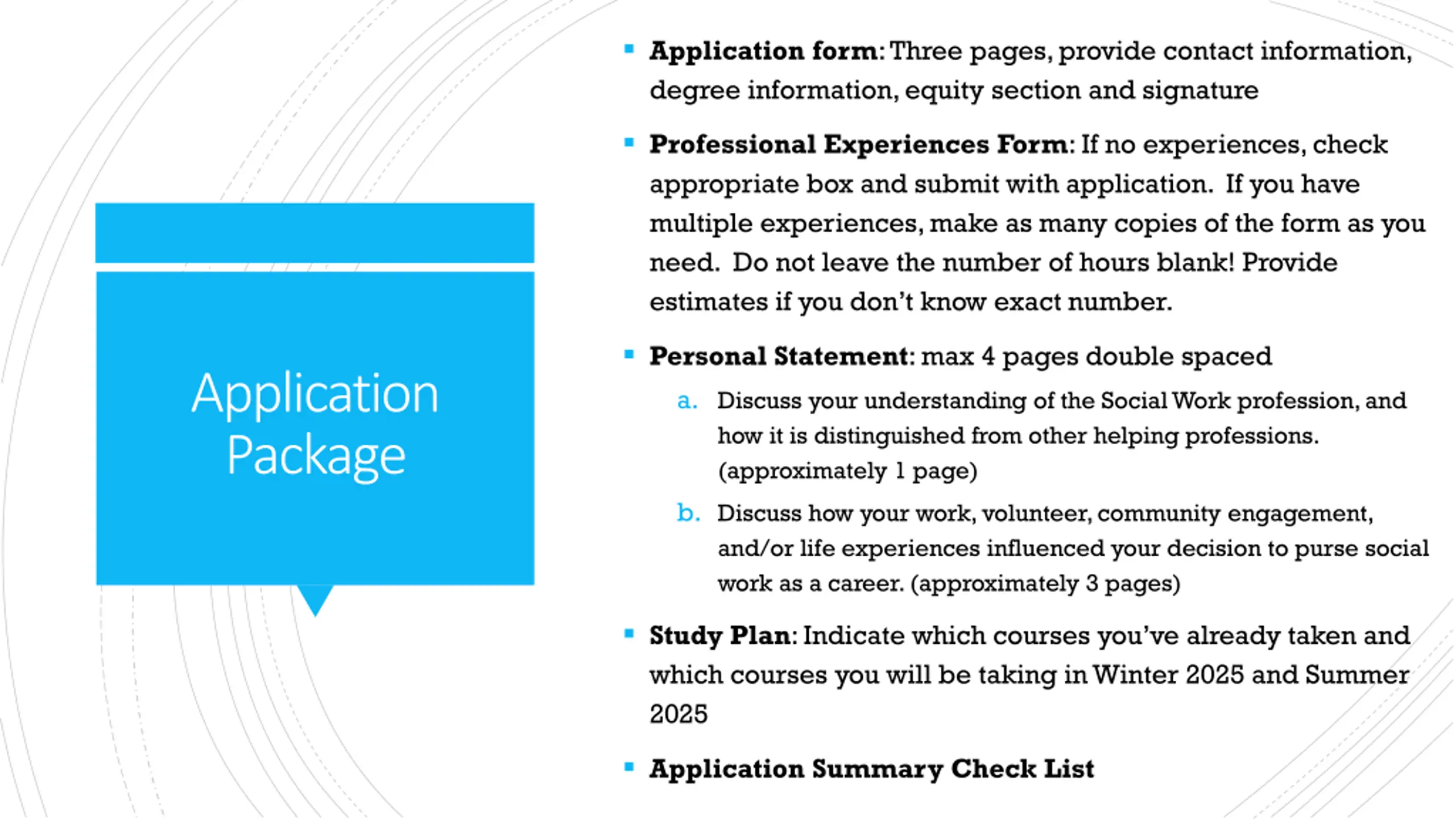 Application form: Three pages, provide contact information, degree information, equity section and signature Professional Experiences Form: If no experiences, check appropriate box and submit with application. If you have multiple experiences, make as many copies of the form as you need. Do not leave the number of hours blank! Provide estimates if you don t know exact number. Personal Statement: max 4 pages double spaced a. Discuss your understanding of the Social Work profession, and how it is distinguished from other helping professions. (approximately 1 page) b. Discuss how your work, volunteer, community engagement, and/or life experiences influenced your decision to purse social work as a career. (approximately 3 pages) Application Package Study Plan: Indicate which courses you ve already taken and which courses you will be taking in Winter 2025 and Summer 2025 Application Summary Check List