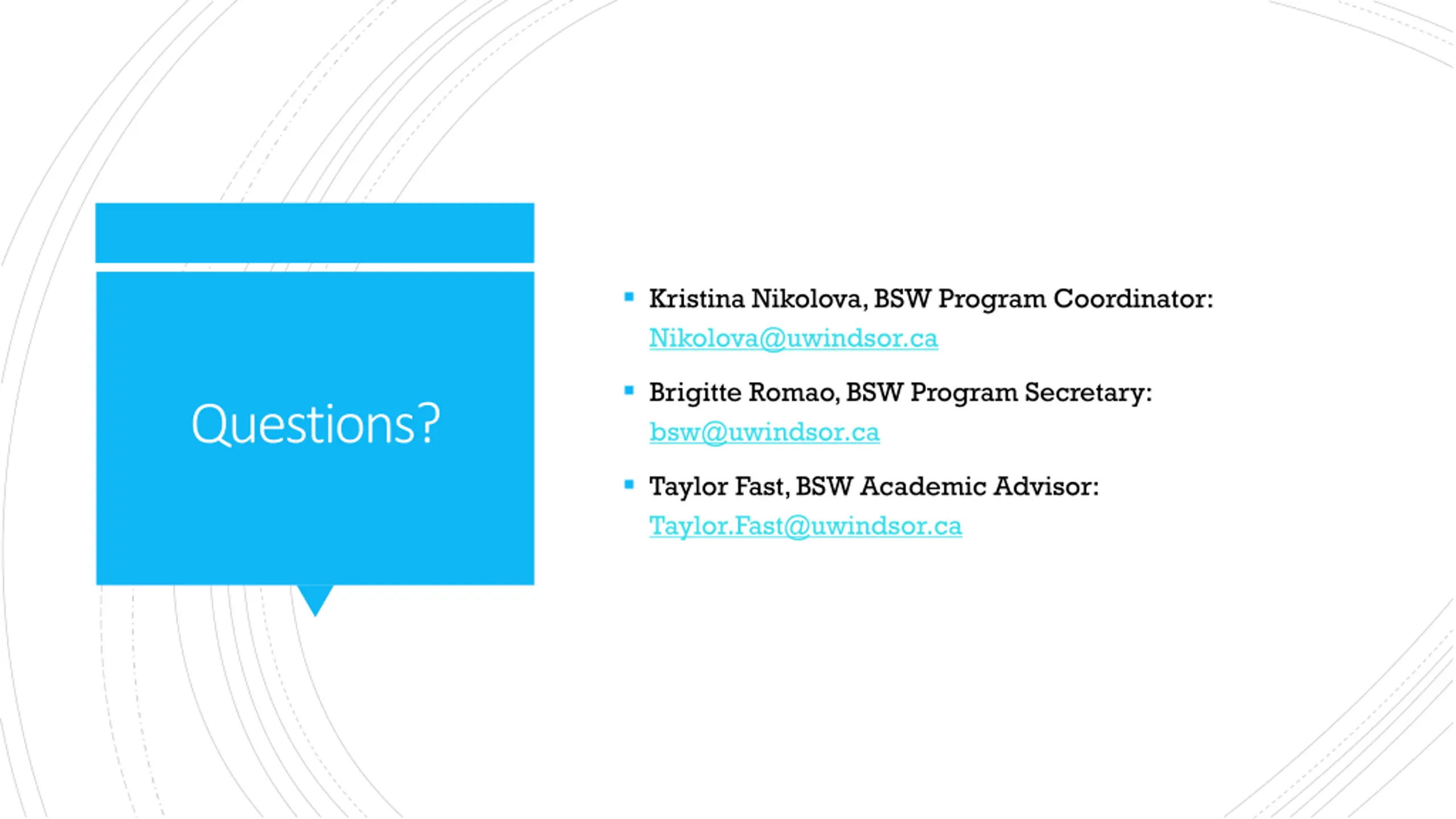 Kristina Nikolova, BSW Program Coordinator: Nikolova@uwindsor.ca Brigitte Romao, BSW Program Secretary: bsw@uwindsor.ca Questions? Taylor Fast, BSW Academic Advisor: Taylor.Fast@uwindsor.ca