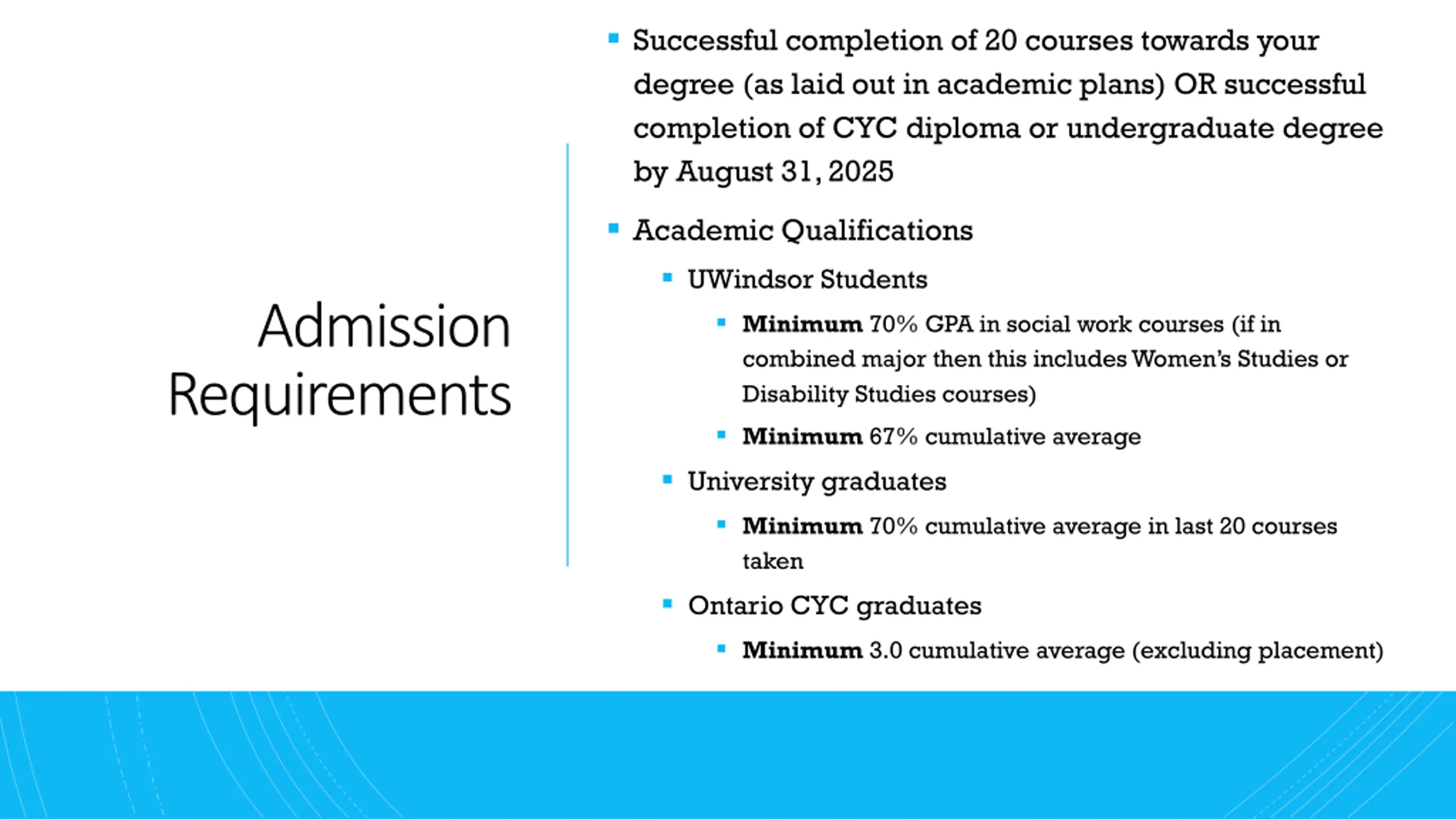 Successful completion of 20 courses towards your degree (as laid out in academic plans) OR successful completion of CYC diploma or undergraduate degree by August 31, 2025 Academic Qualifications UWindsor Students Minimum 70% GPA in social work courses (if in combined major then this includes Women s Studies or Disability Studies courses) Minimum 67% cumulative average University graduates Minimum 70% cumulative average in last 20 courses taken Ontario CYC graduates Minimum 3.0 cumulative average (excluding placement) Admission Requirements