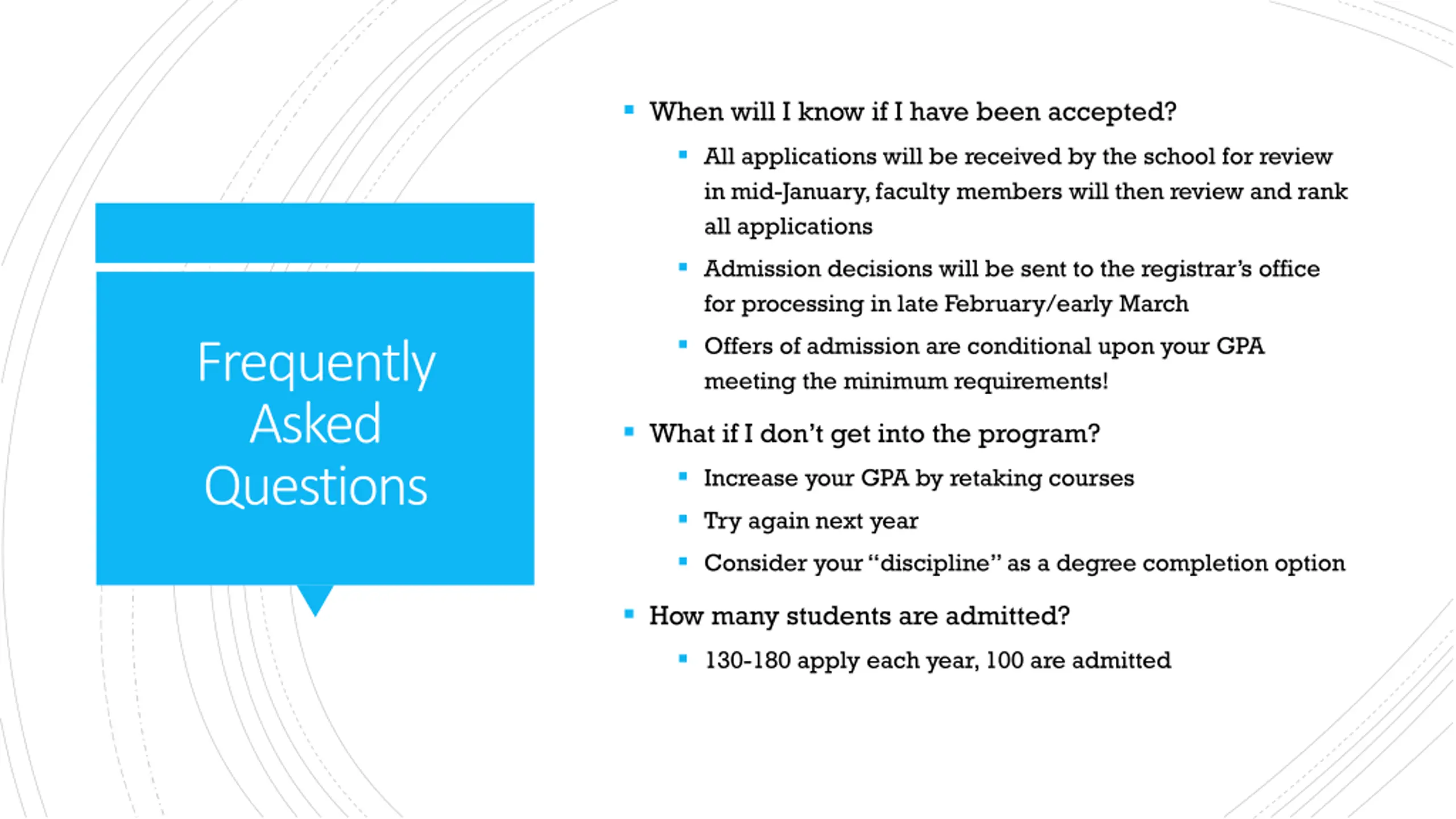 When will I know if I have been accepted? All applications will be received by the school for review in mid-January, faculty members will then review and rank all applications Admission decisions will be sent to the registrar s office for processing in late February/early March Offers of admission are conditional upon your GPA meeting the minimum requirements! Frequently Asked Questions What if I don t get into the program? Increase your GPA by retaking courses Try again next year Consider your discipline as a degree completion option How many students are admitted? 130-180 apply each year, 100 are admitted