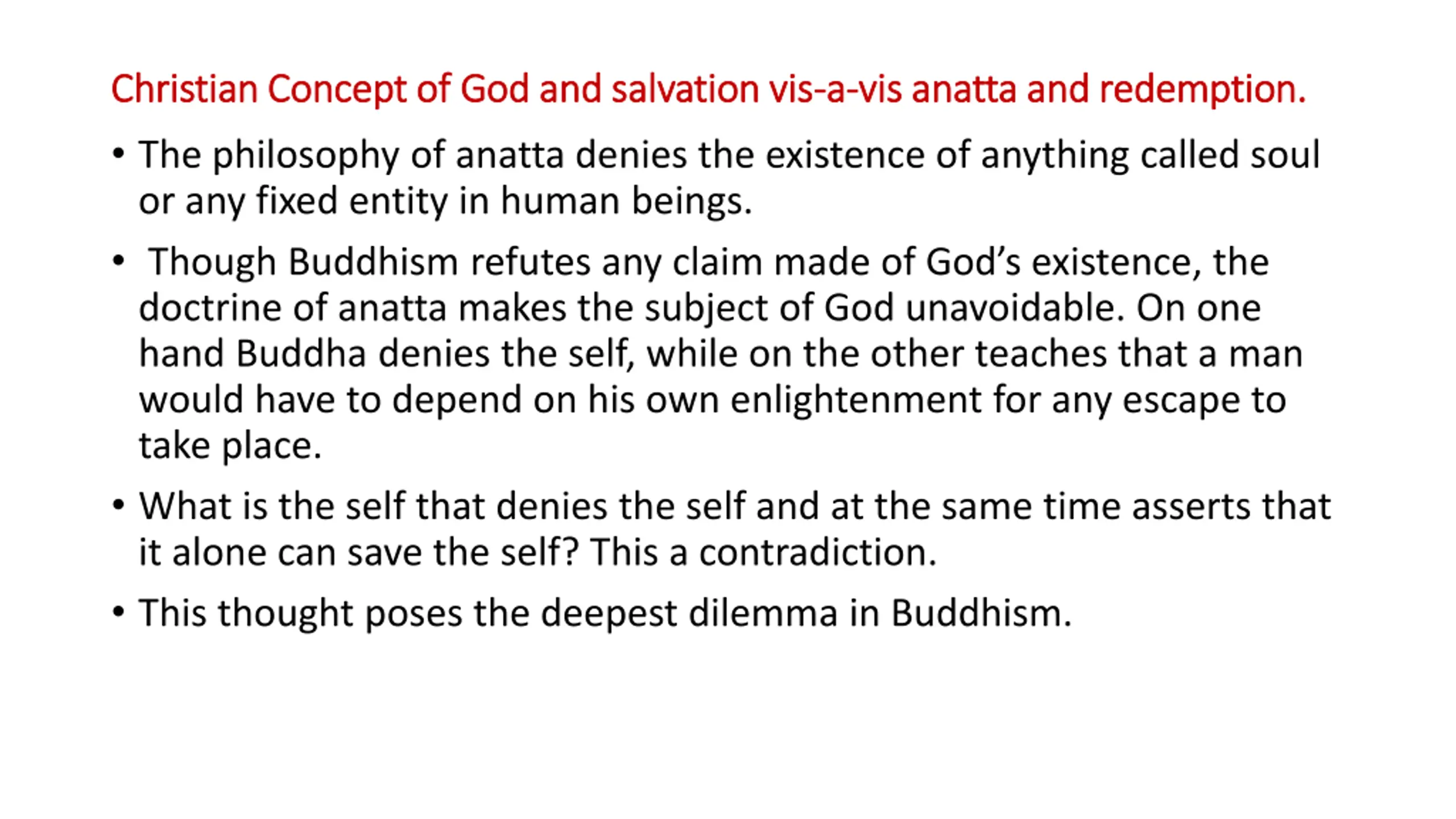 Christian Concept of God and salvation vis Christian Concept of God and salvation vis- -a a- -vis The philosophy of anatta denies the existence of anything called soul or any fixed entity in human beings. Though Buddhism refutes any claim made of God s existence, the doctrine of anatta makes the subject of God unavoidable. On one hand Buddha denies the self, while on the other teaches that a man would have to depend on his own enlightenment for any escape to take place. What is the self that denies the self and at the same time asserts that it alone can save the self? This a contradiction. This thought poses the deepest dilemma in Buddhism. vis anatta anatta and redemption. and redemption.