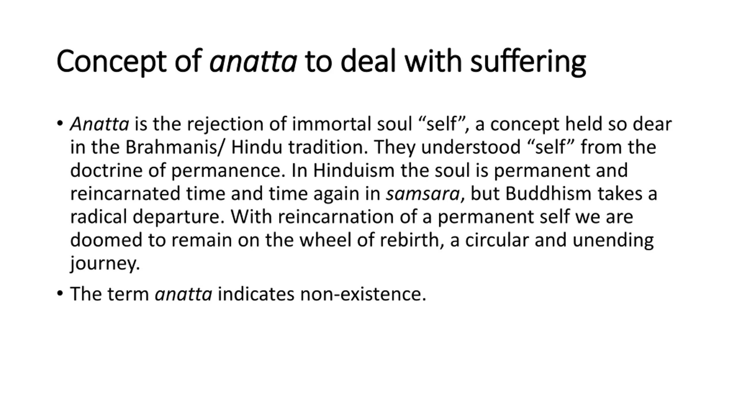 Concept of Concept of anatta anatta to deal with suffering to deal with suffering Anattais the rejection of immortal soul self , a concept held so dear in the Brahmanis/ Hindu tradition. They understood self from the doctrine of permanence. In Hinduism the soul is permanent and reincarnated time and time again in samsara, but Buddhism takes a radical departure. With reincarnation of a permanent self we are doomed to remain on the wheel of rebirth, a circular and unending journey. The term anatta indicates non-existence.