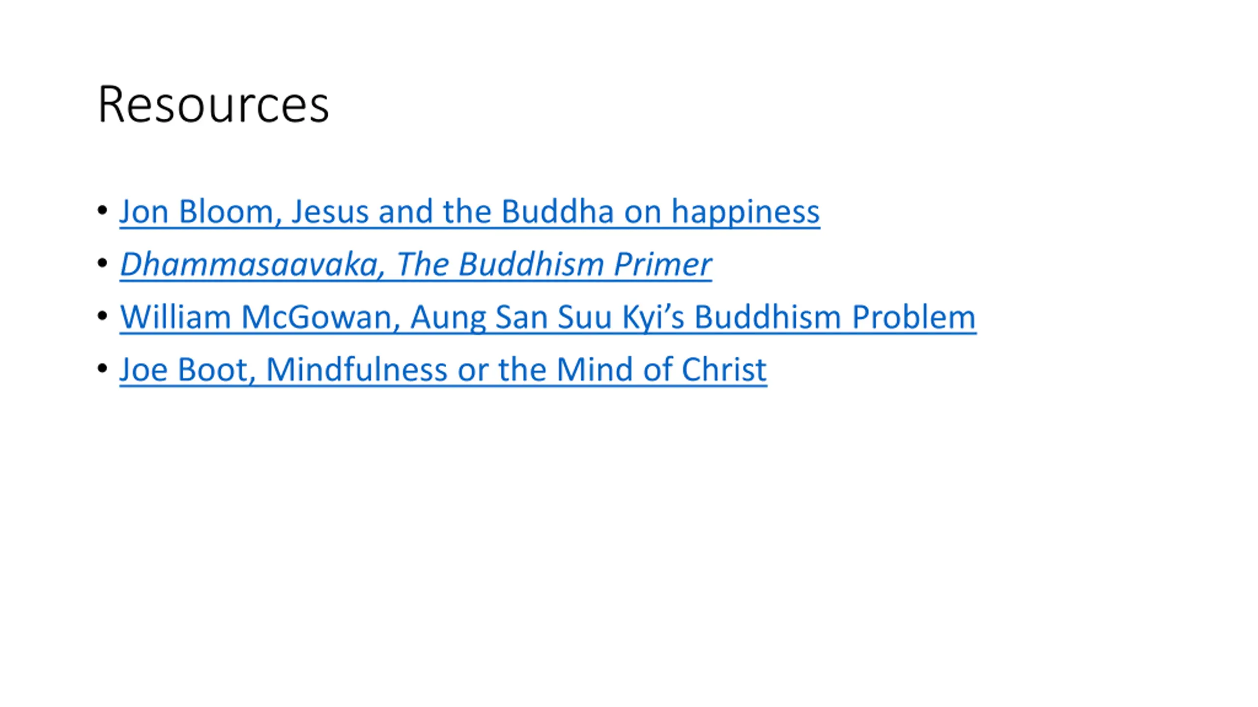 Resources Jon Bloom, Jesus and the Buddha on happiness Dhammasaavaka, The Buddhism Primer William McGowan, Aung San Suu Kyi s Buddhism Problem Joe Boot, Mindfulness or the Mind of Christ