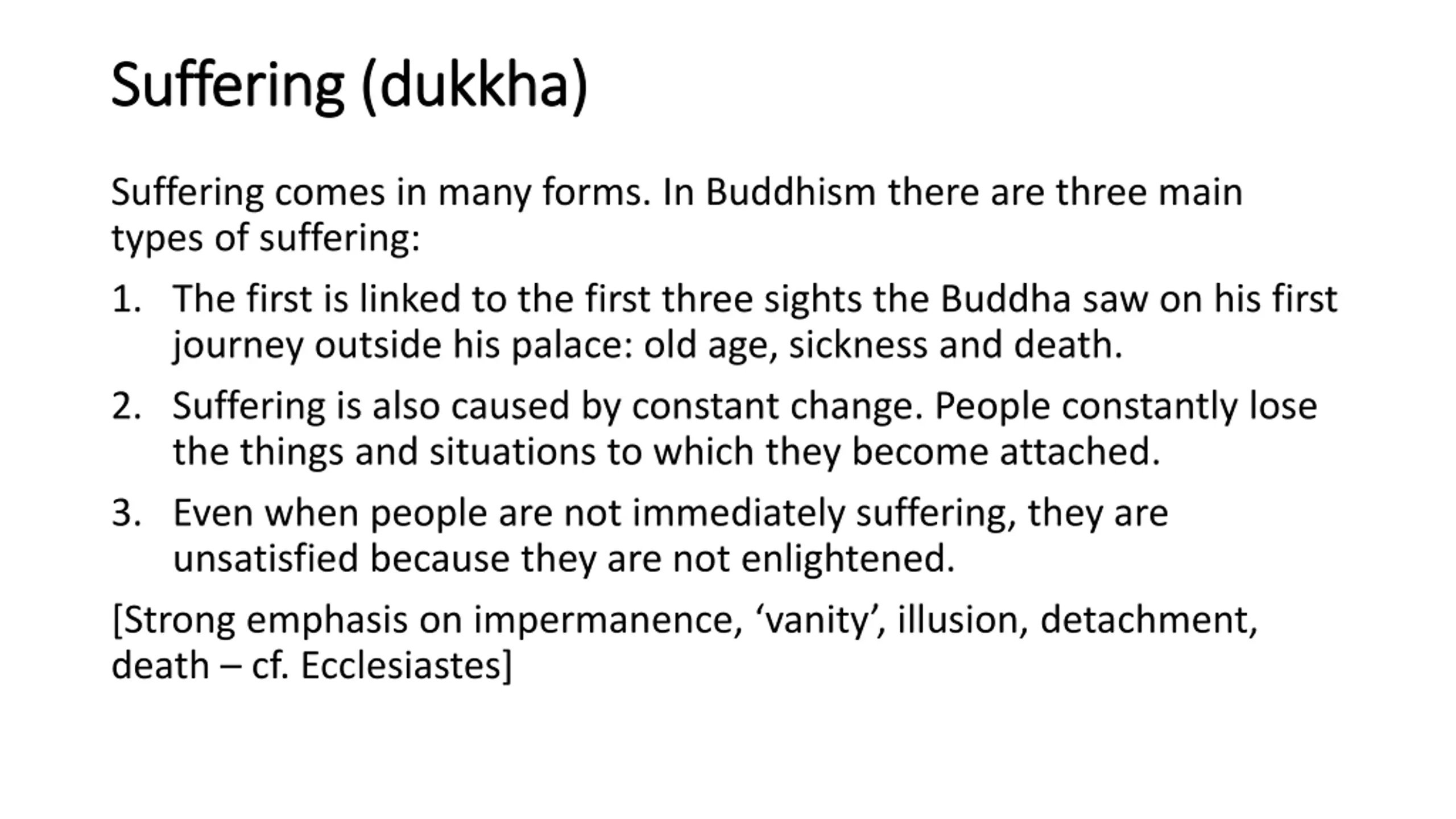 Suffering (dukkha) Suffering (dukkha) Suffering comes in many forms. In Buddhism there are three main types of suffering: 1. The first is linked to the first three sights the Buddha saw on his first journey outside his palace: old age, sickness and death. 2. Suffering is also caused by constant change. People constantly lose the things and situations to which they become attached. 3. Even when people are not immediately suffering, they are unsatisfied because they are not enlightened. [Strong emphasis on impermanence, vanity , illusion, detachment, death cf. Ecclesiastes]