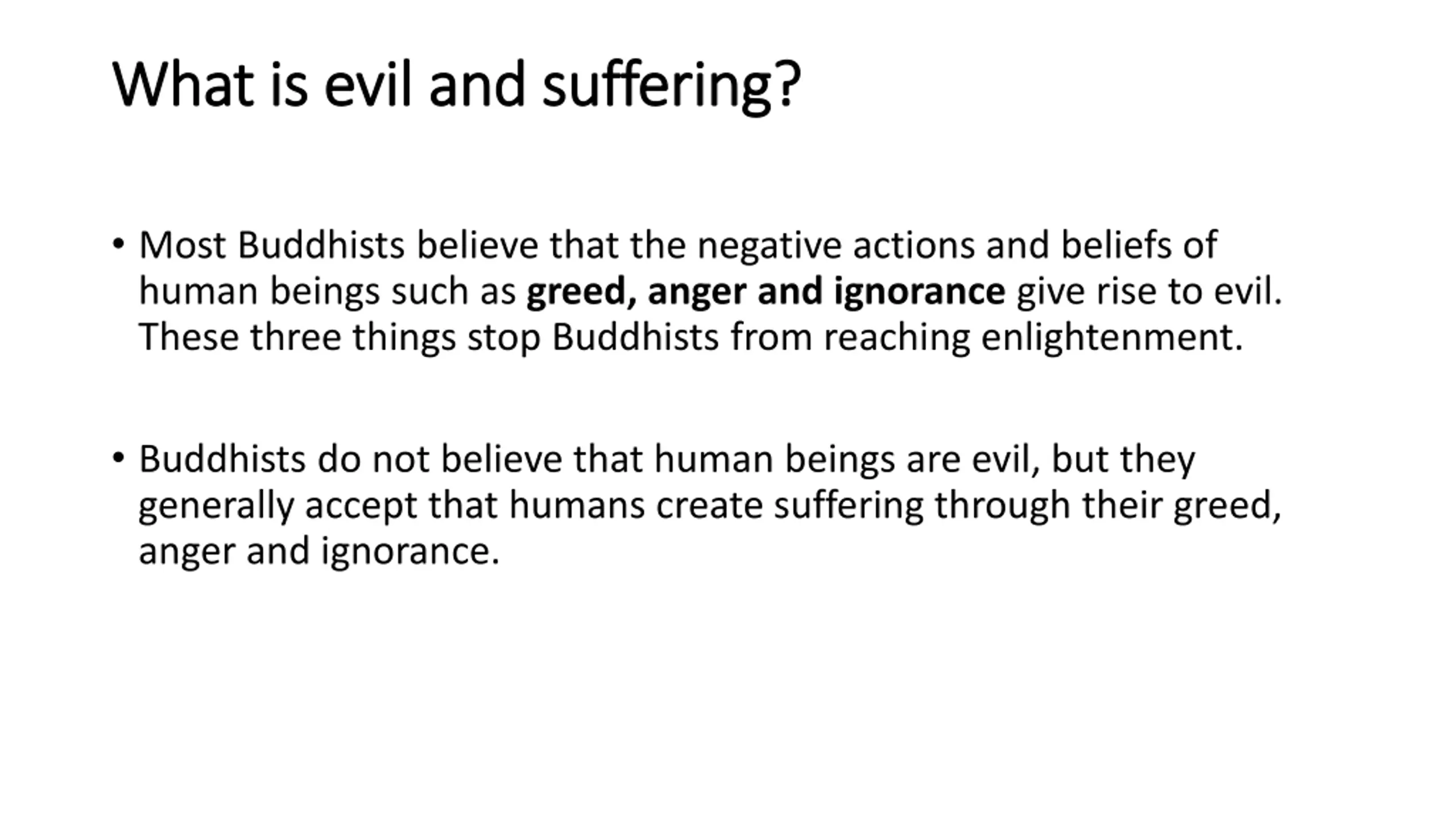 What is evil and suffering? What is evil and suffering? Most Buddhists believe that the negative actions and beliefs of human beings such as greed, anger and ignorance give rise to evil. These three things stop Buddhists from reaching enlightenment. Buddhists do not believe that human beings are evil, but they generally accept that humans create suffering through their greed, anger and ignorance.