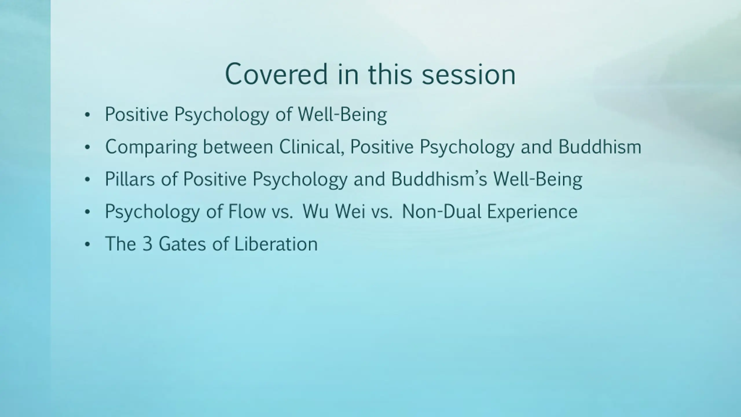 Covered in this session Positive Psychology of Well-Being Comparing between Clinical, Positive Psychology and Buddhism Pillars of Positive Psychology and Buddhism s Well-Being Psychology of Flow vs. Wu Wei vs. Non-Dual Experience The 3 Gates of Liberation