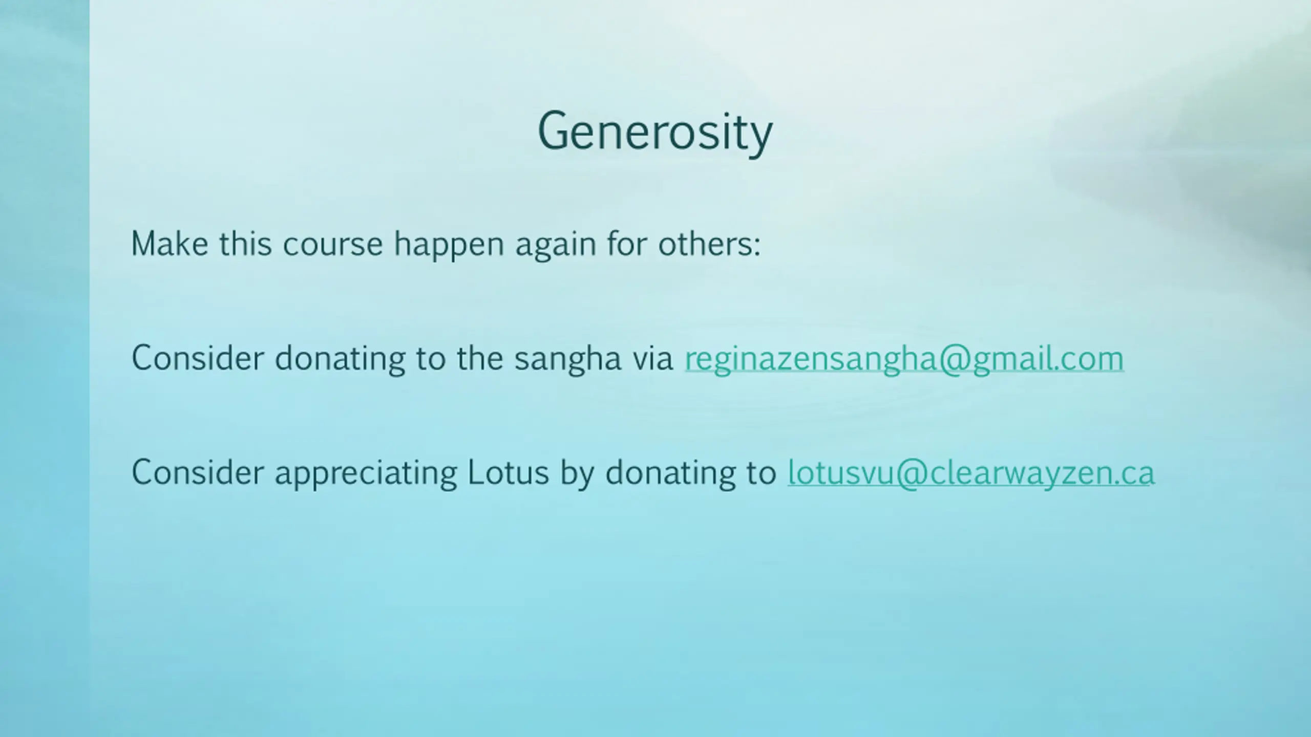 Generosity Make this course happen again for others: Consider donating to the sangha via reginazensangha@gmail.com Consider appreciating Lotus by donating to lotusvu@clearwayzen.ca