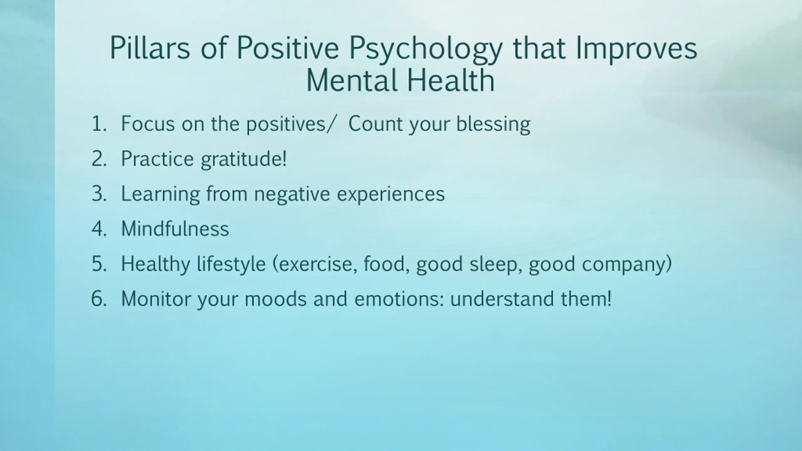 Pillars of Positive Psychology that Improves Mental Health 1. Focus on the positives/ Count your blessing 2. Practice gratitude! 3. Learning from negative experiences 4. Mindfulness 5. Healthy lifestyle (exercise, food, good sleep, good company) 6. Monitor your moods and emotions: understand them!
