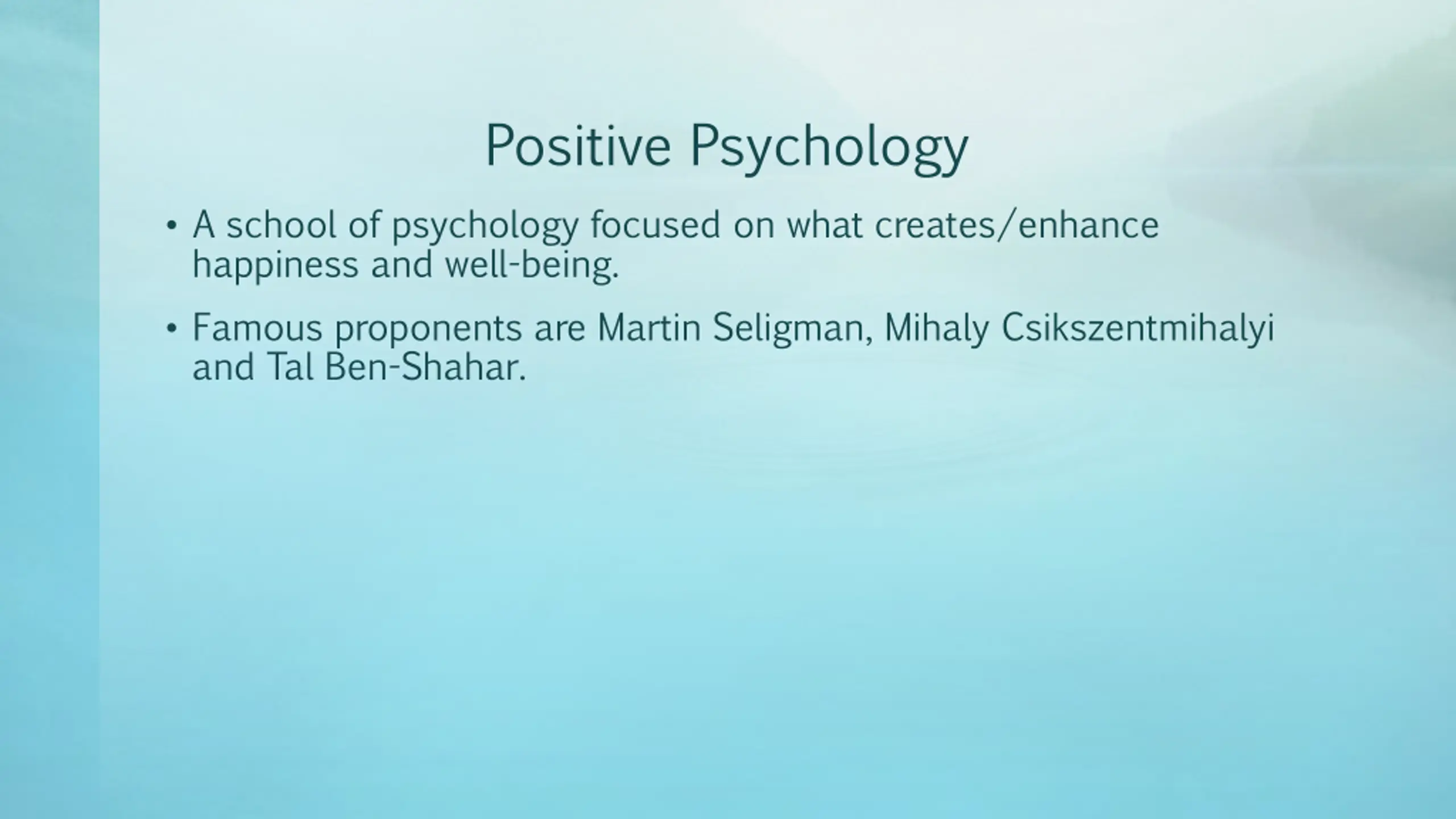 Positive Psychology A school of psychology focused on what creates/enhance happiness and well-being. Famous proponents are Martin Seligman, Mihaly Csikszentmihalyi and Tal Ben-Shahar.