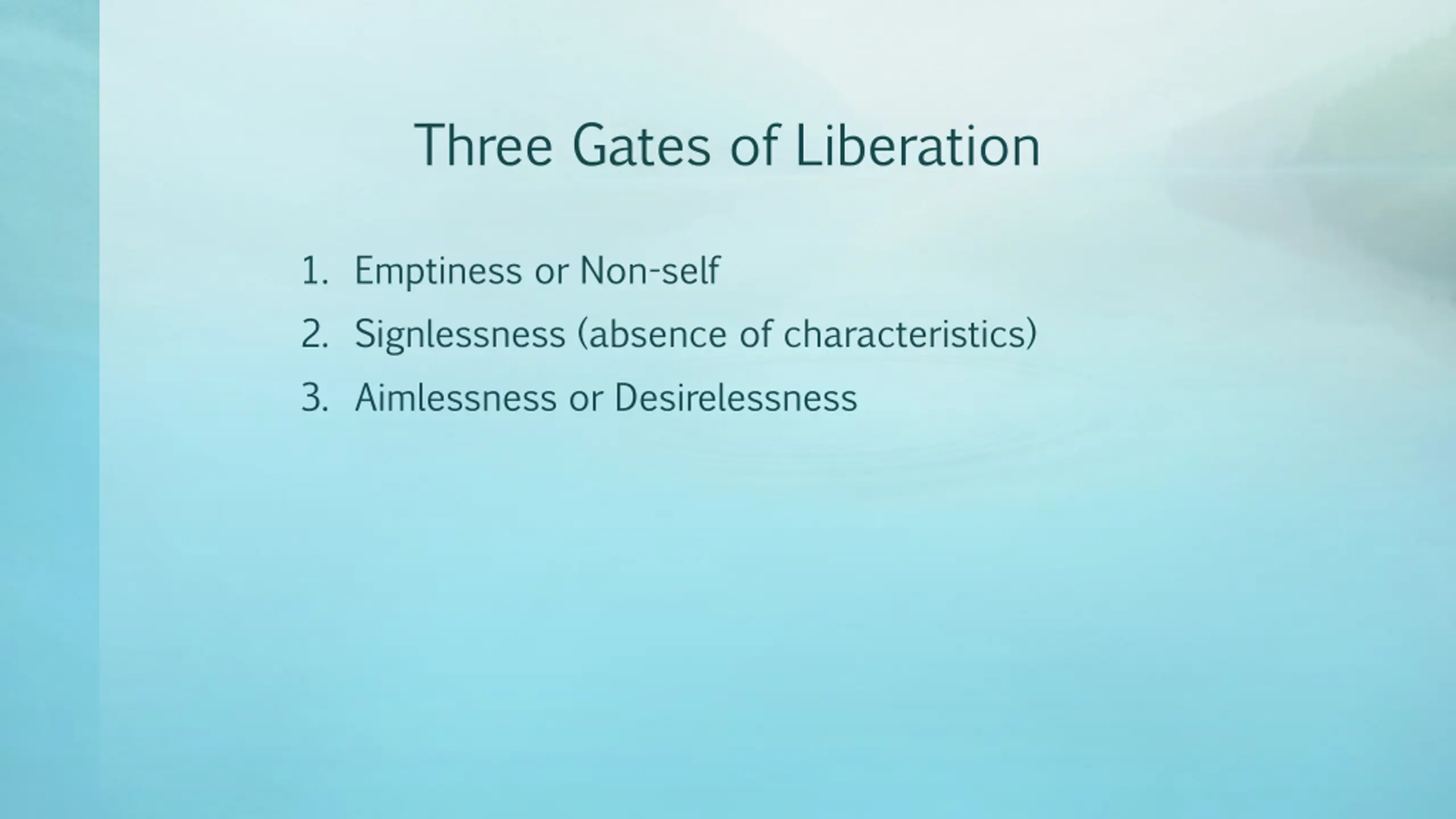 Three Gates of Liberation 1. Emptiness or Non-self 2. Signlessness (absence of characteristics) 3. Aimlessness or Desirelessness