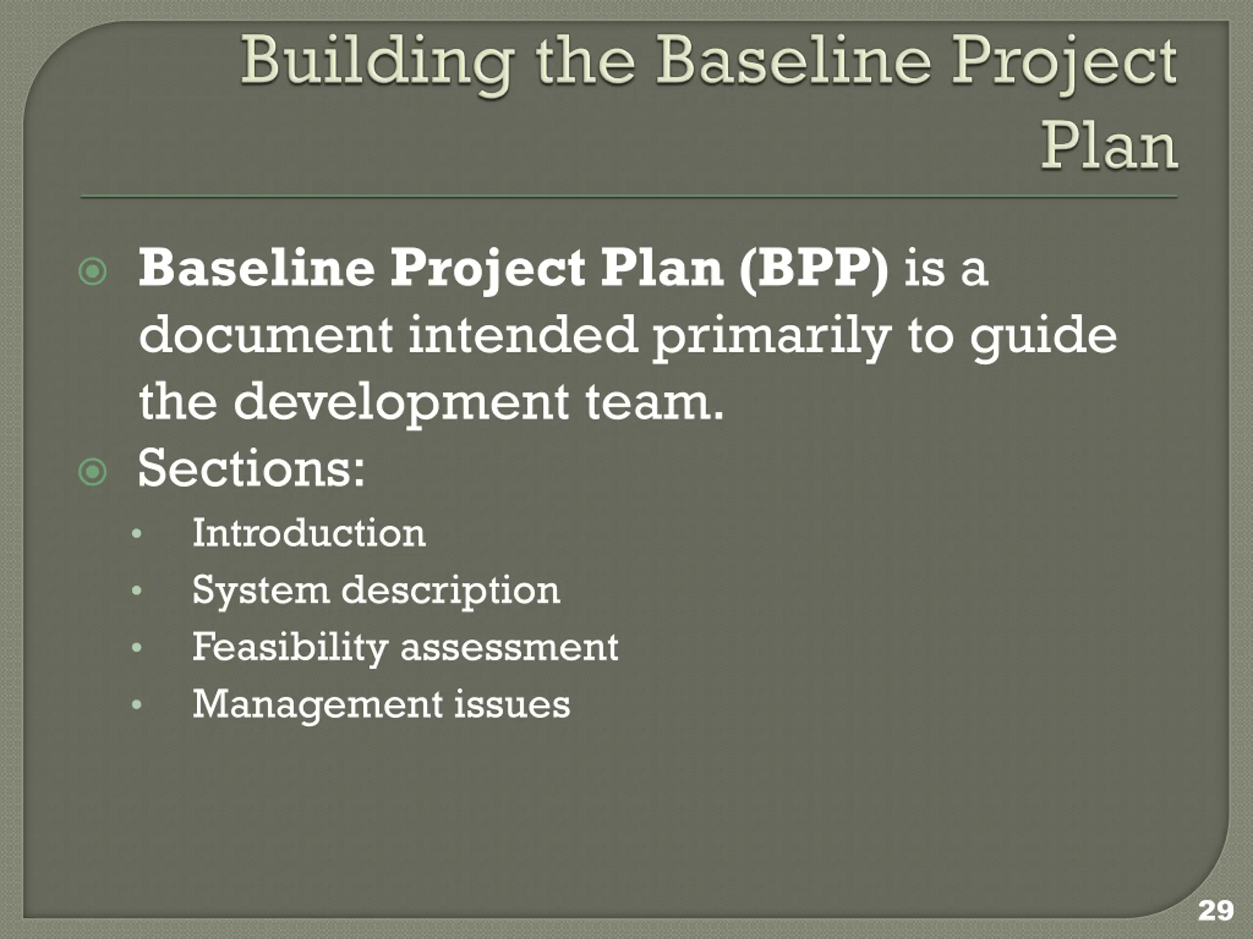 Baseline Project Plan (BPP) is a document intended primarily to guide the development team. Sections: Introduction System description Feasibility assessment Management issues 29