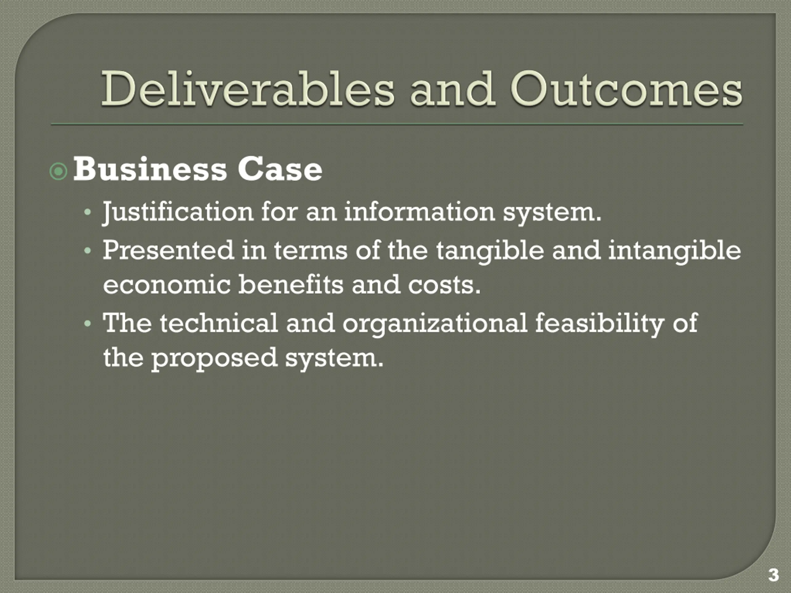 Business Case Justification for an information system. Presented in terms of the tangible and intangible economic benefits and costs. The technical and organizational feasibility of the proposed system. 3