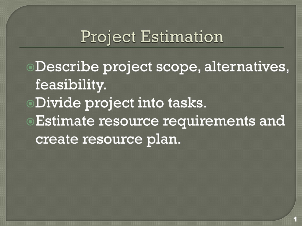 Describe project scope, alternatives, feasibility. Divide project into tasks. Estimate resource requirements and create resource plan. 1