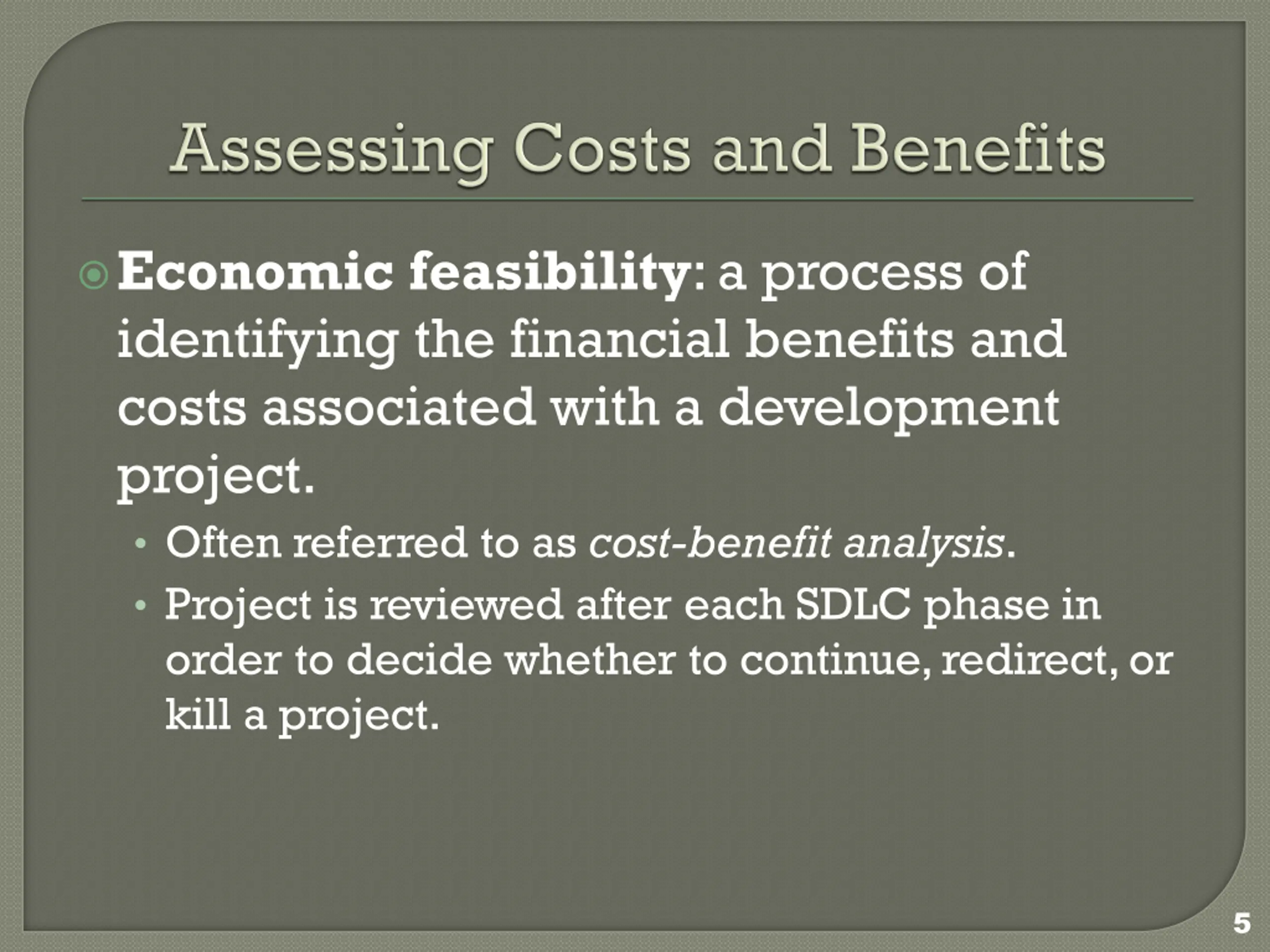 Economic feasibility: a process of identifying the financial benefits and costs associated with a development project. Often referred to as cost-benefit analysis. Project is reviewed after each SDLC phase in order to decide whether to continue, redirect, or kill a project. 5