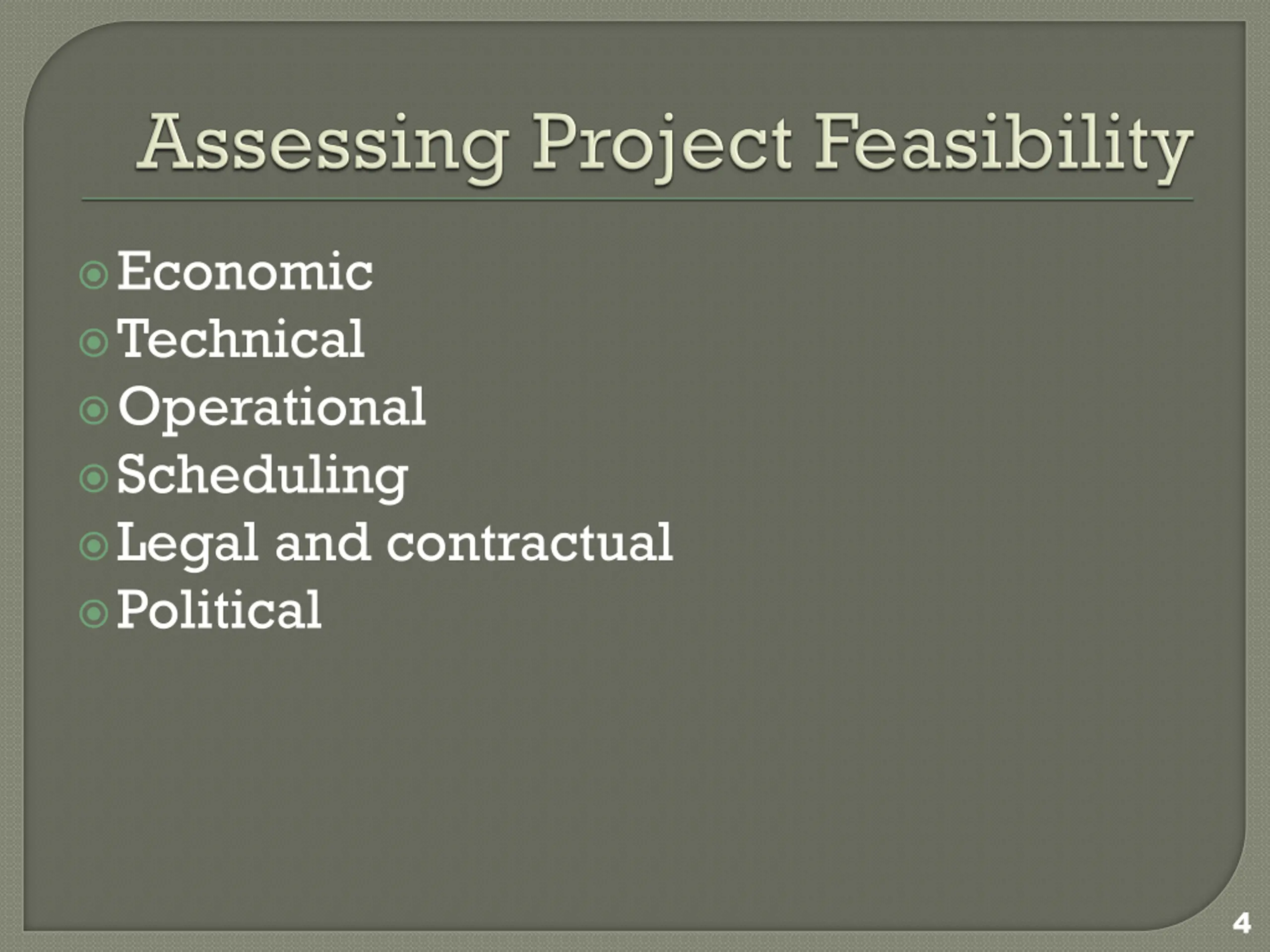 Economic Technical Operational Scheduling Legal and contractual Political 4