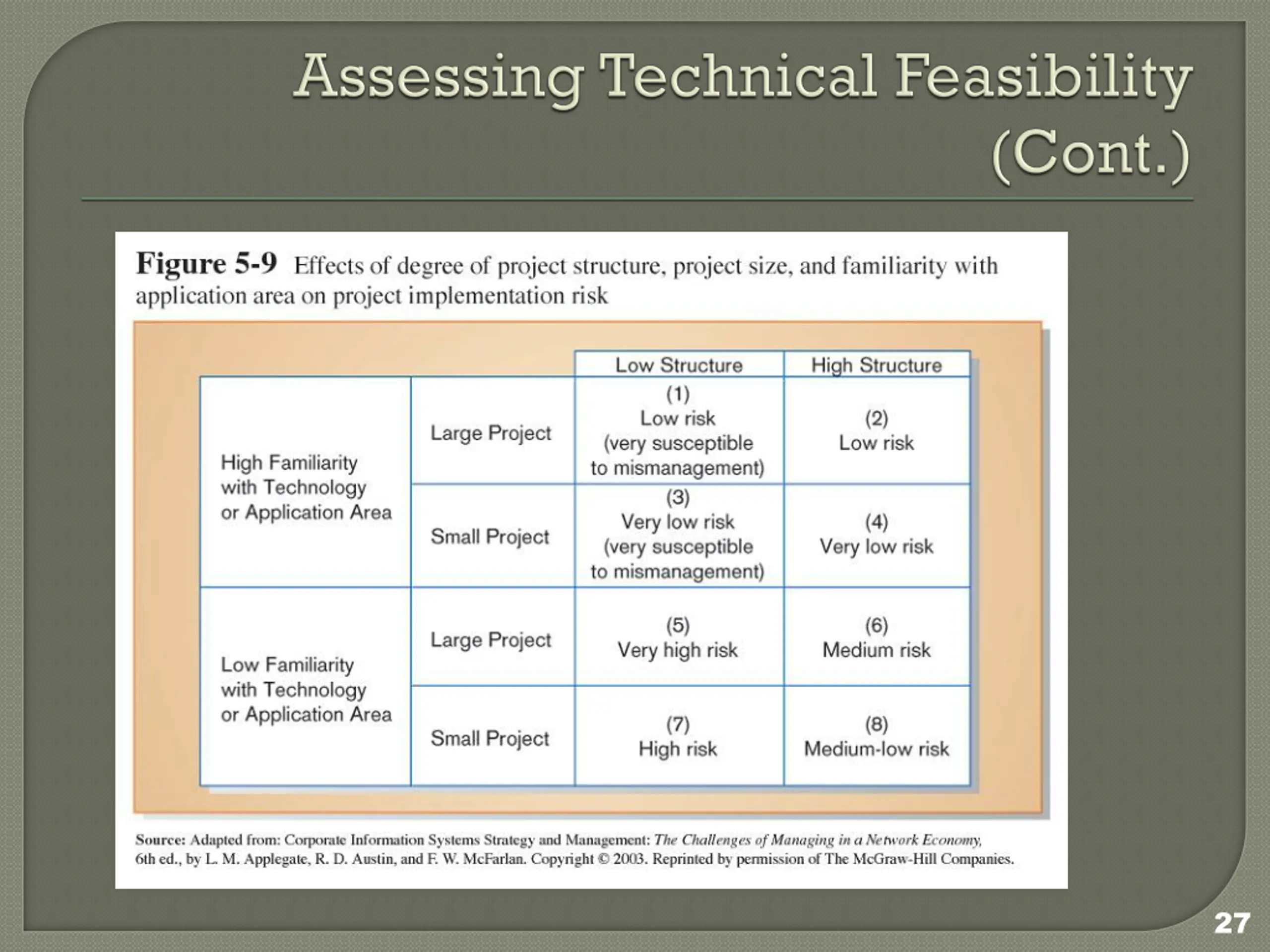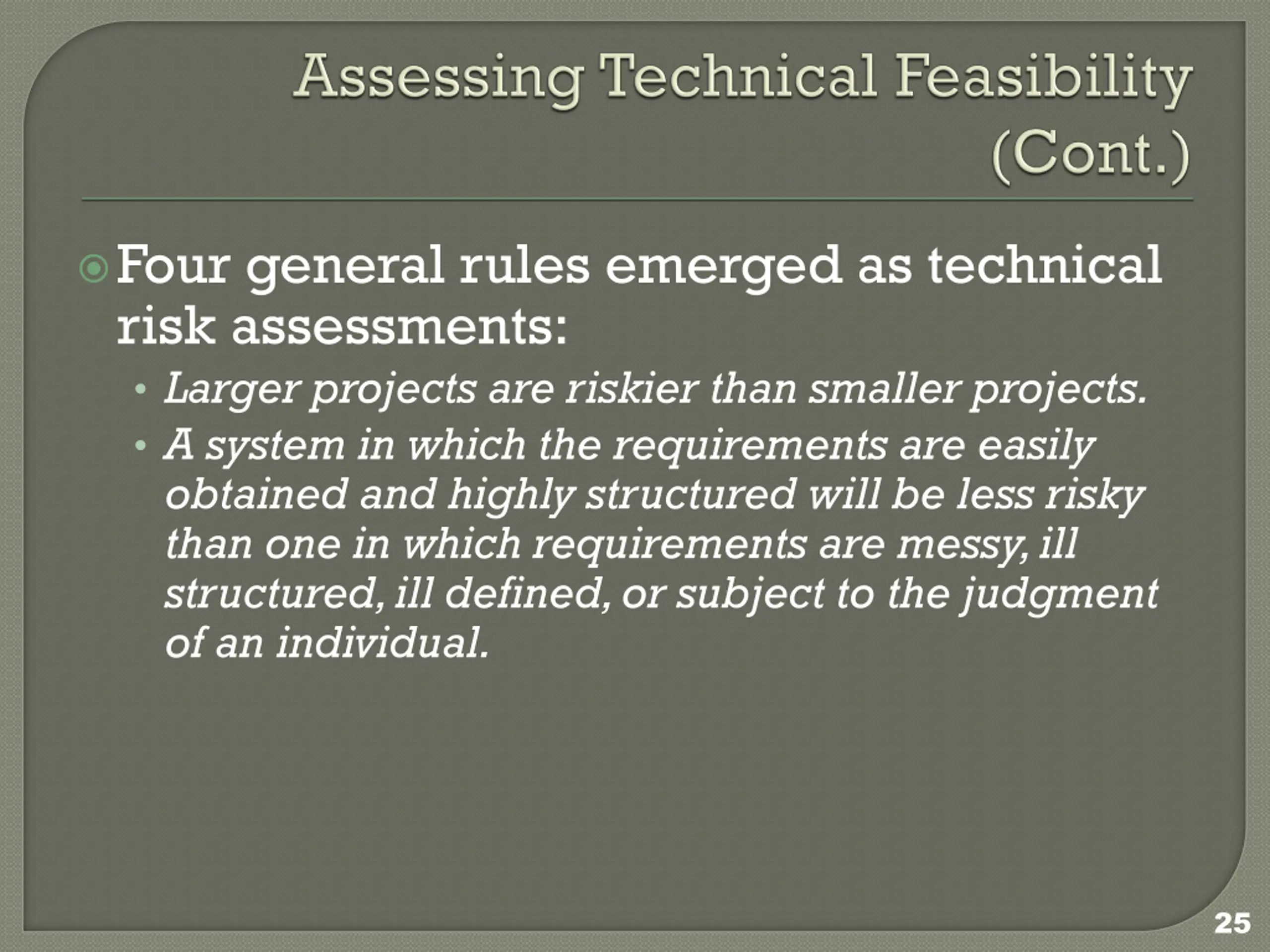 Four general rules emerged as technical risk assessments: Larger projects are riskier than smaller projects. A system in which the requirements are easily obtained and highly structured will be less risky than one in which requirements are messy, ill structured, ill defined, or subject to the judgment of an individual. 25