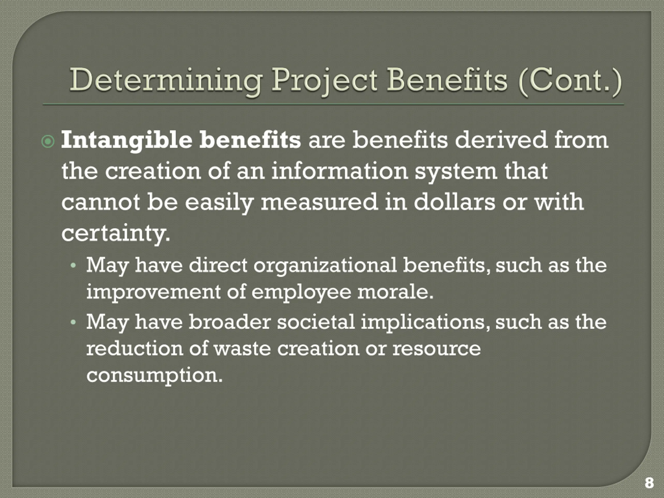 Intangible benefits are benefits derived from the creation of an information system that cannot be easily measured in dollars or with certainty. May have direct organizational benefits, such as the improvement of employee morale. May have broader societal implications, such as the reduction of waste creation or resource consumption. 8
