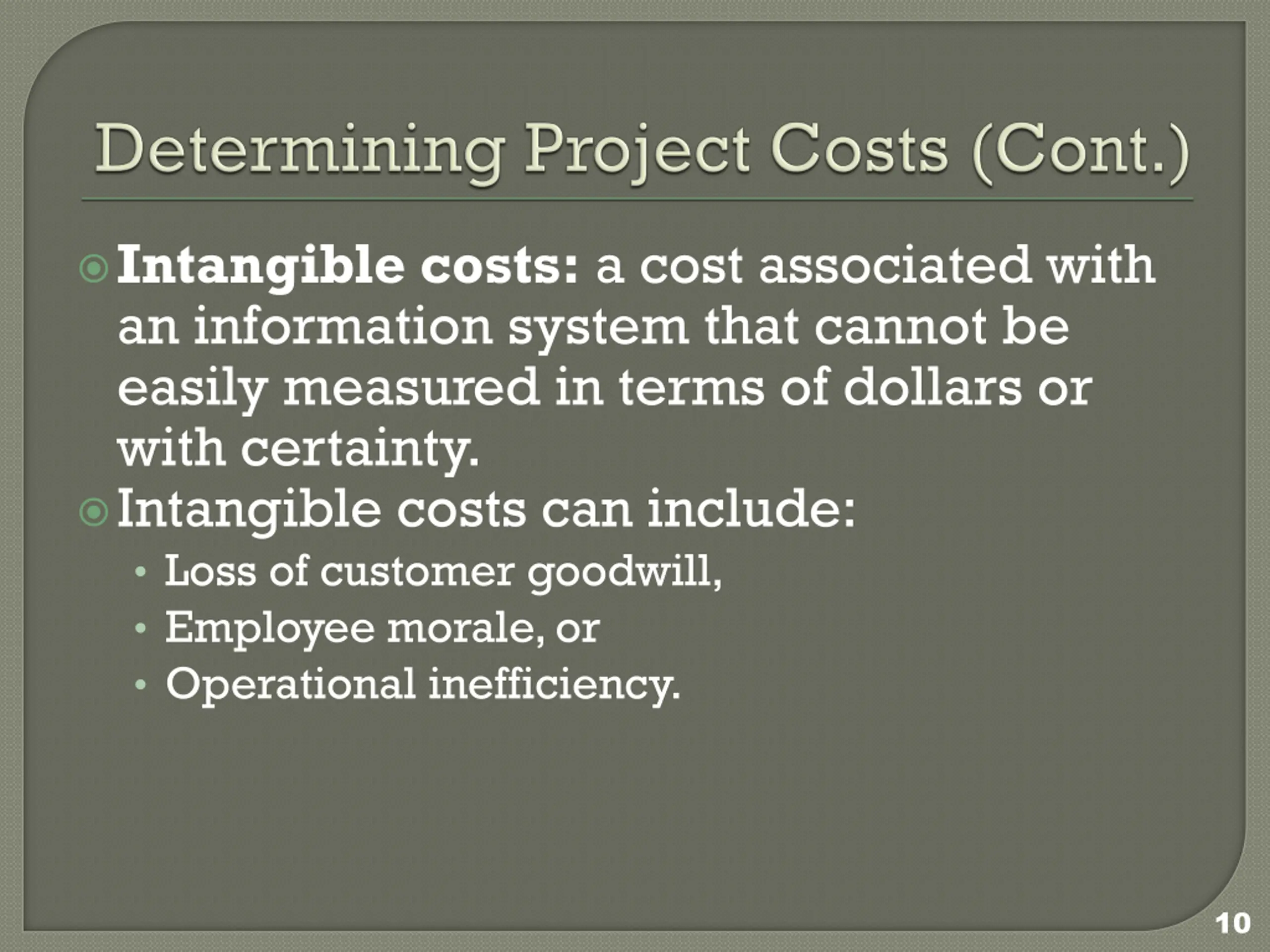 Intangible costs: a cost associated with an information system that cannot be easily measured in terms of dollars or with certainty. Intangible costs can include: Loss of customer goodwill, Employee morale, or Operational inefficiency. 10