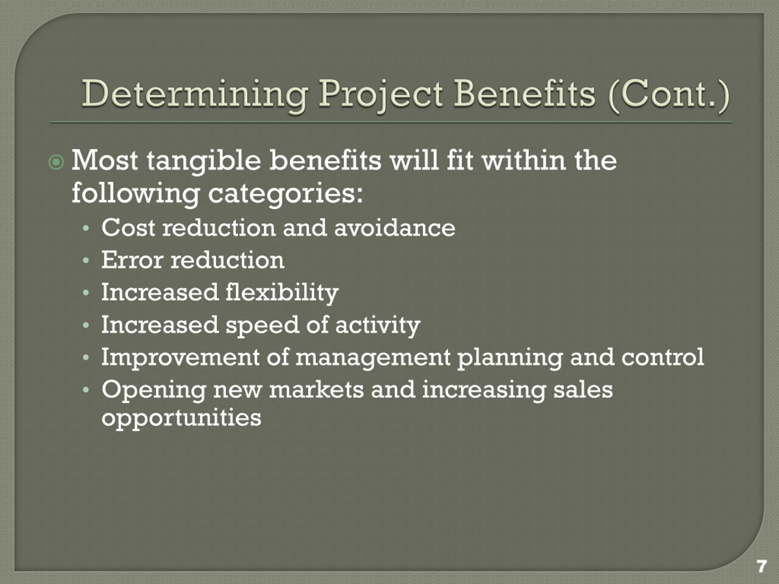 Most tangible benefits will fit within the following categories: Cost reduction and avoidance Error reduction Increased flexibility Increased speed of activity Improvement of management planning and control Opening new markets and increasing sales opportunities 7