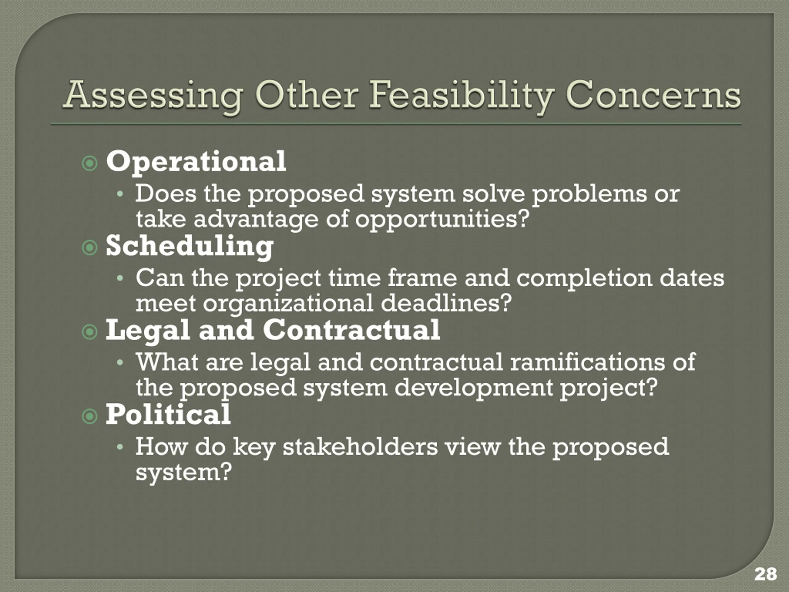 Operational Does the proposed system solve problems or take advantage of opportunities? Scheduling Can the project time frame and completion dates meet organizational deadlines? Legal and Contractual What are legal and contractual ramifications of the proposed system development project? Political How do key stakeholders view the proposed system? 28