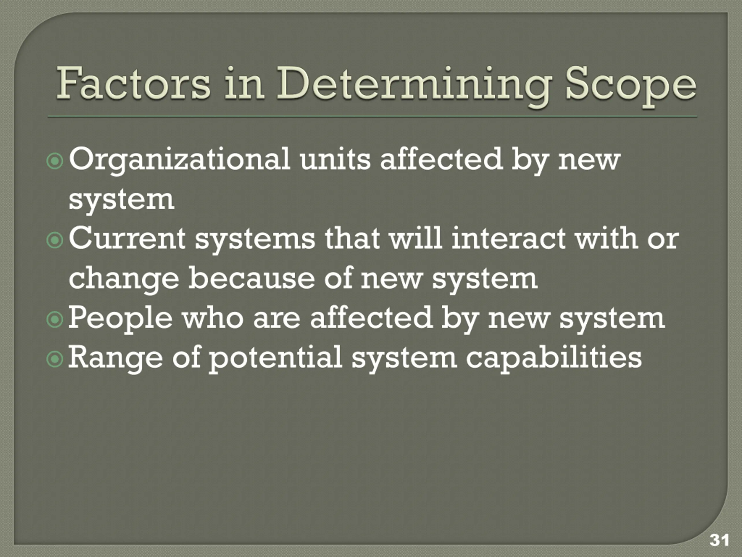 Organizational units affected by new system Current systems that will interact with or change because of new system People who are affected by new system Range of potential system capabilities 31