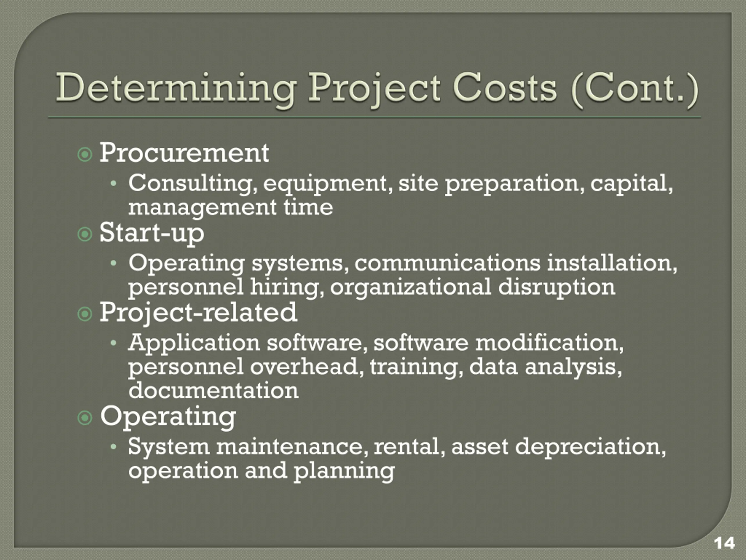 Procurement Consulting, equipment, site preparation, capital, management time Start-up Operating systems, communications installation, personnel hiring, organizational disruption Project-related Application software, software modification, personnel overhead, training, data analysis, documentation Operating System maintenance, rental, asset depreciation, operation and planning 14