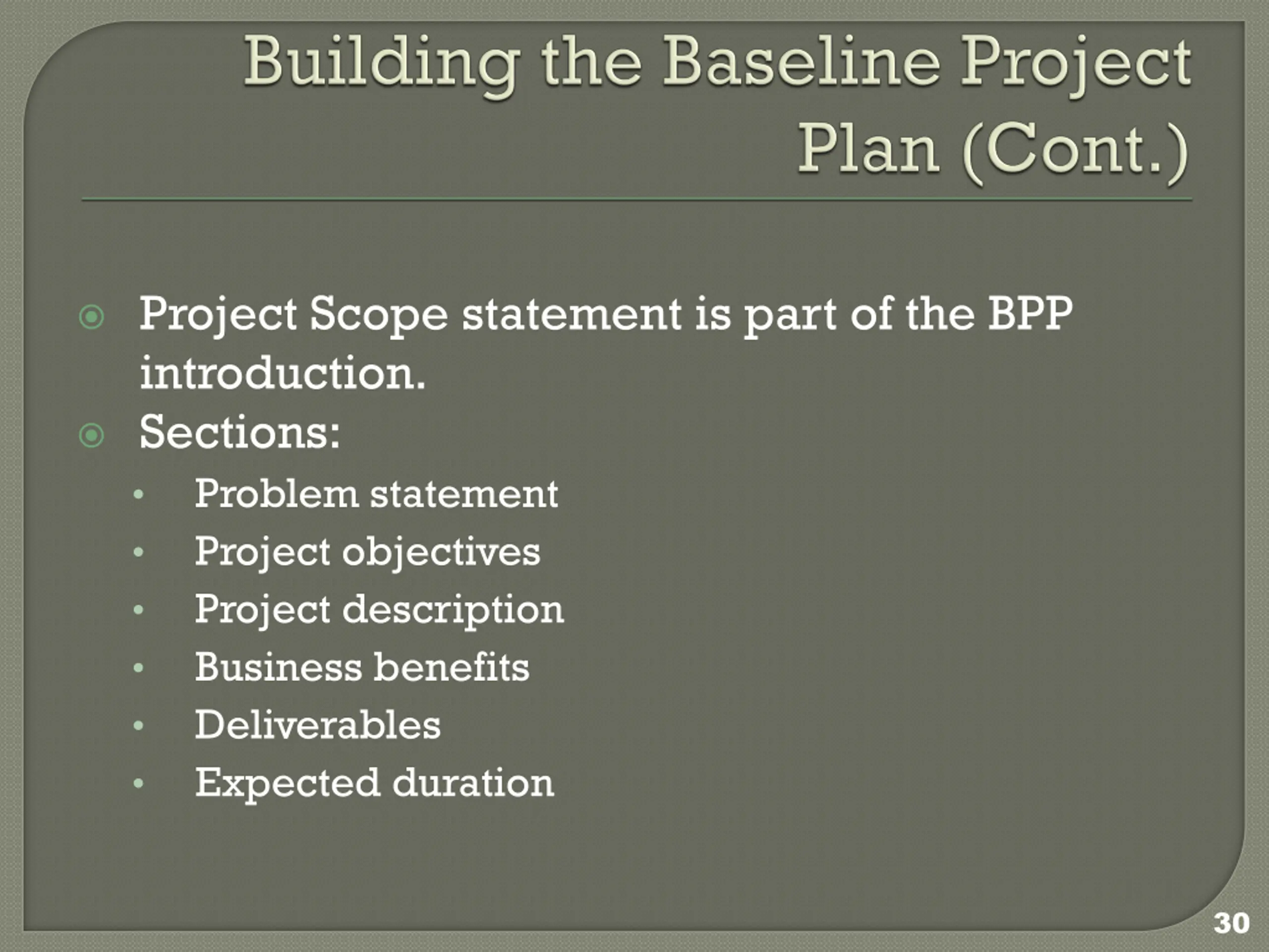 Project Scope statement is part of the BPP introduction. Sections: Problem statement Project objectives Project description Business benefits Deliverables Expected duration 30