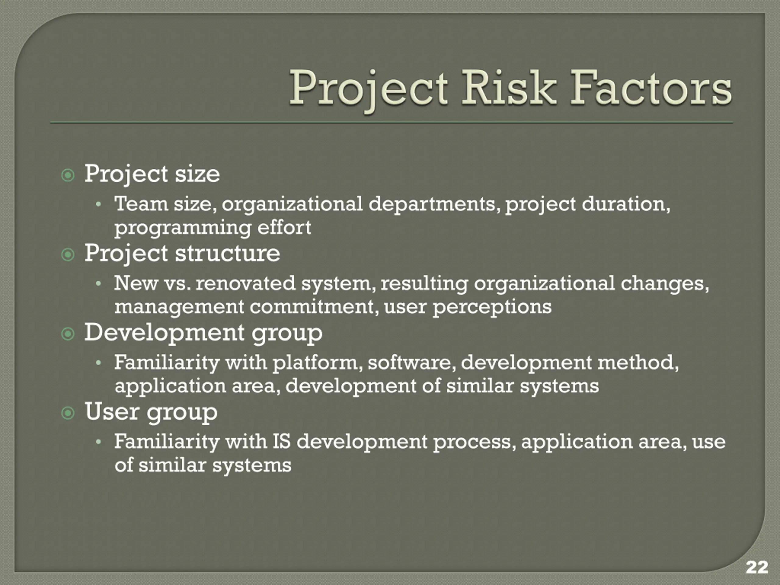 Project size Team size, organizational departments, project duration, programming effort Project structure New vs. renovated system, resulting organizational changes, management commitment, user perceptions Development group Familiarity with platform, software, development method, application area, development of similar systems User group Familiarity with IS development process, application area, use of similar systems 22