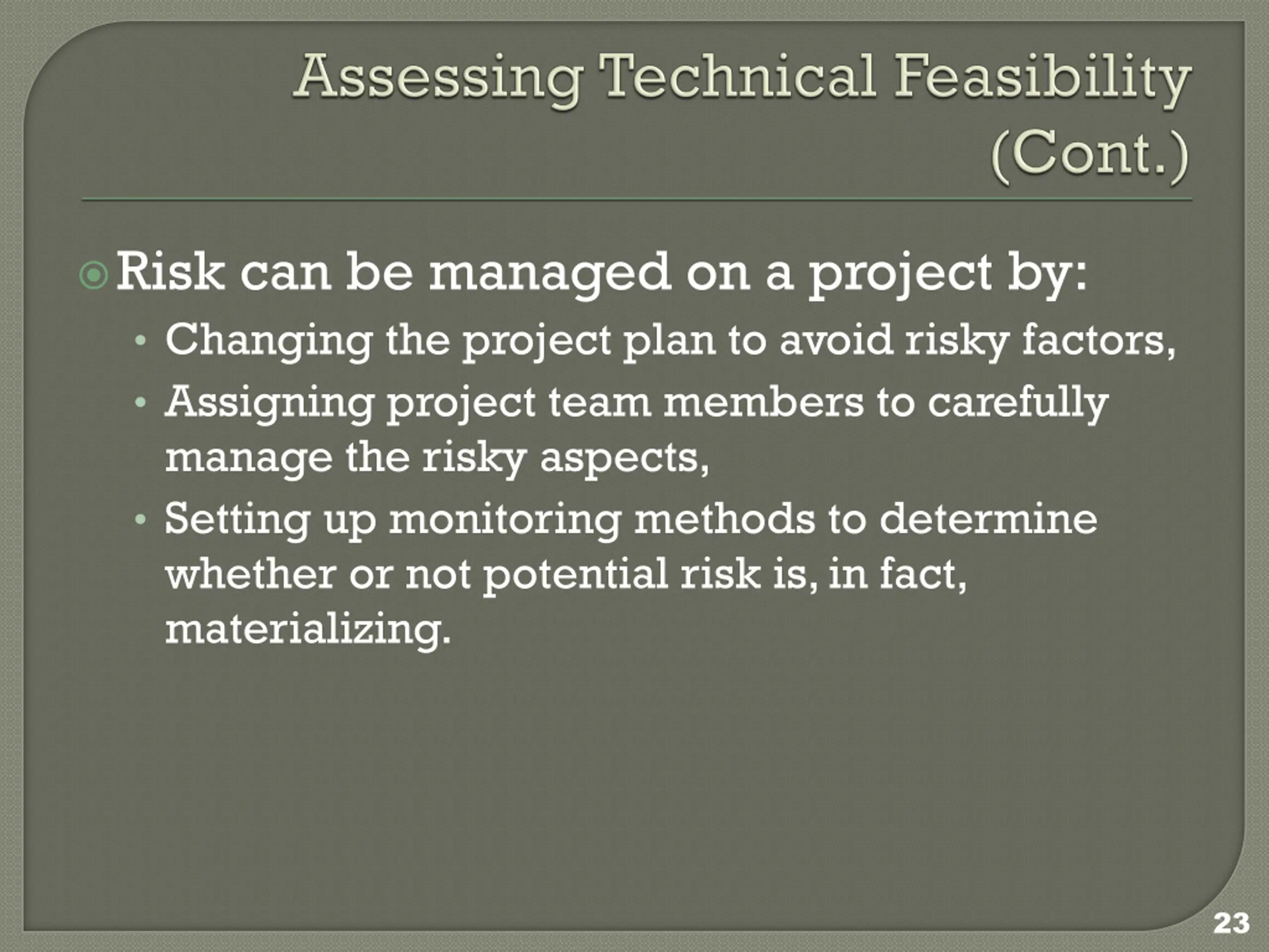 Risk can be managed on a project by: Changing the project plan to avoid risky factors, Assigning project team members to carefully manage the risky aspects, Setting up monitoring methods to determine whether or not potential risk is, in fact, materializing. 23