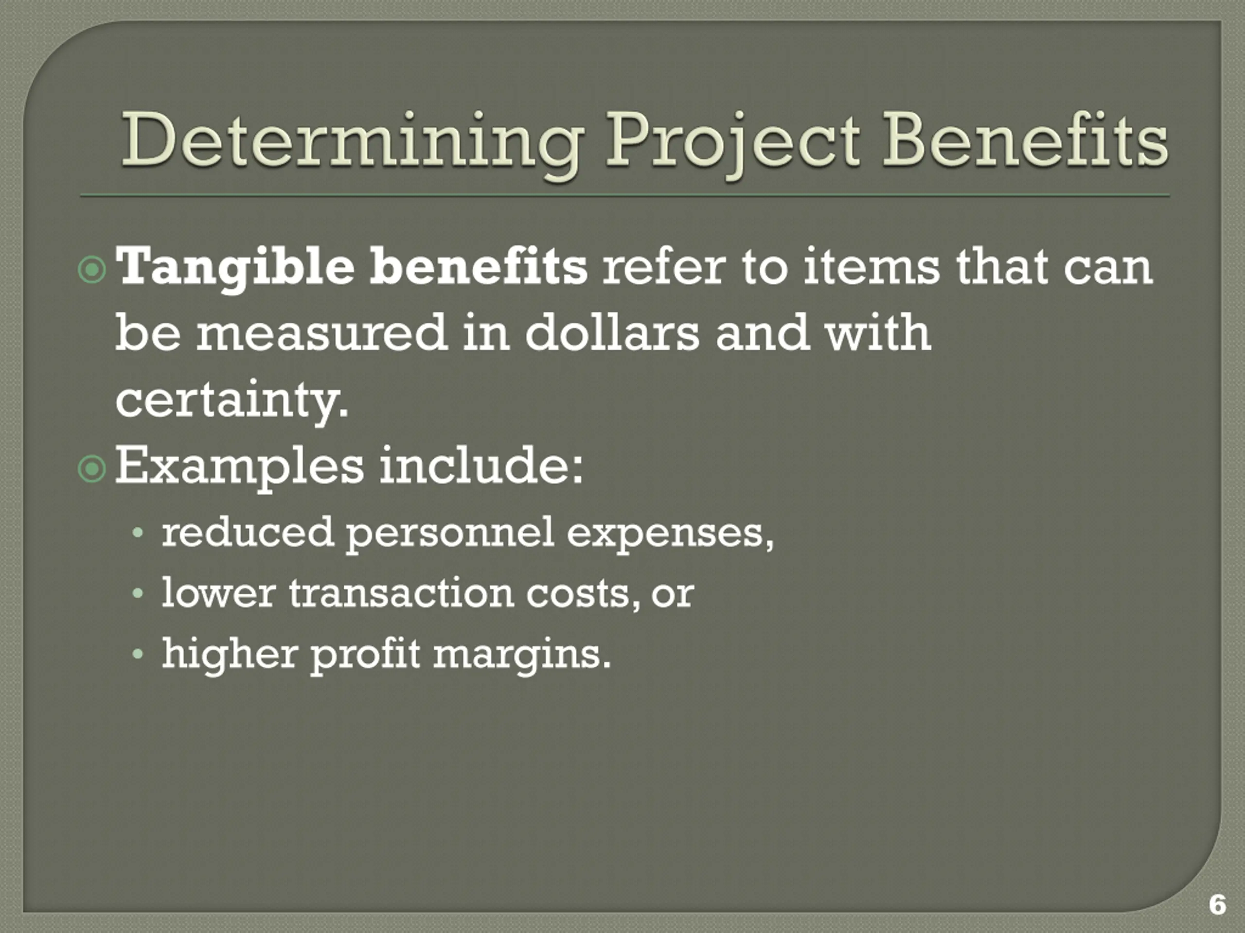 Tangible benefits refer to items that can be measured in dollars and with certainty. Examples include: reduced personnel expenses, lower transaction costs, or higher profit margins. 6