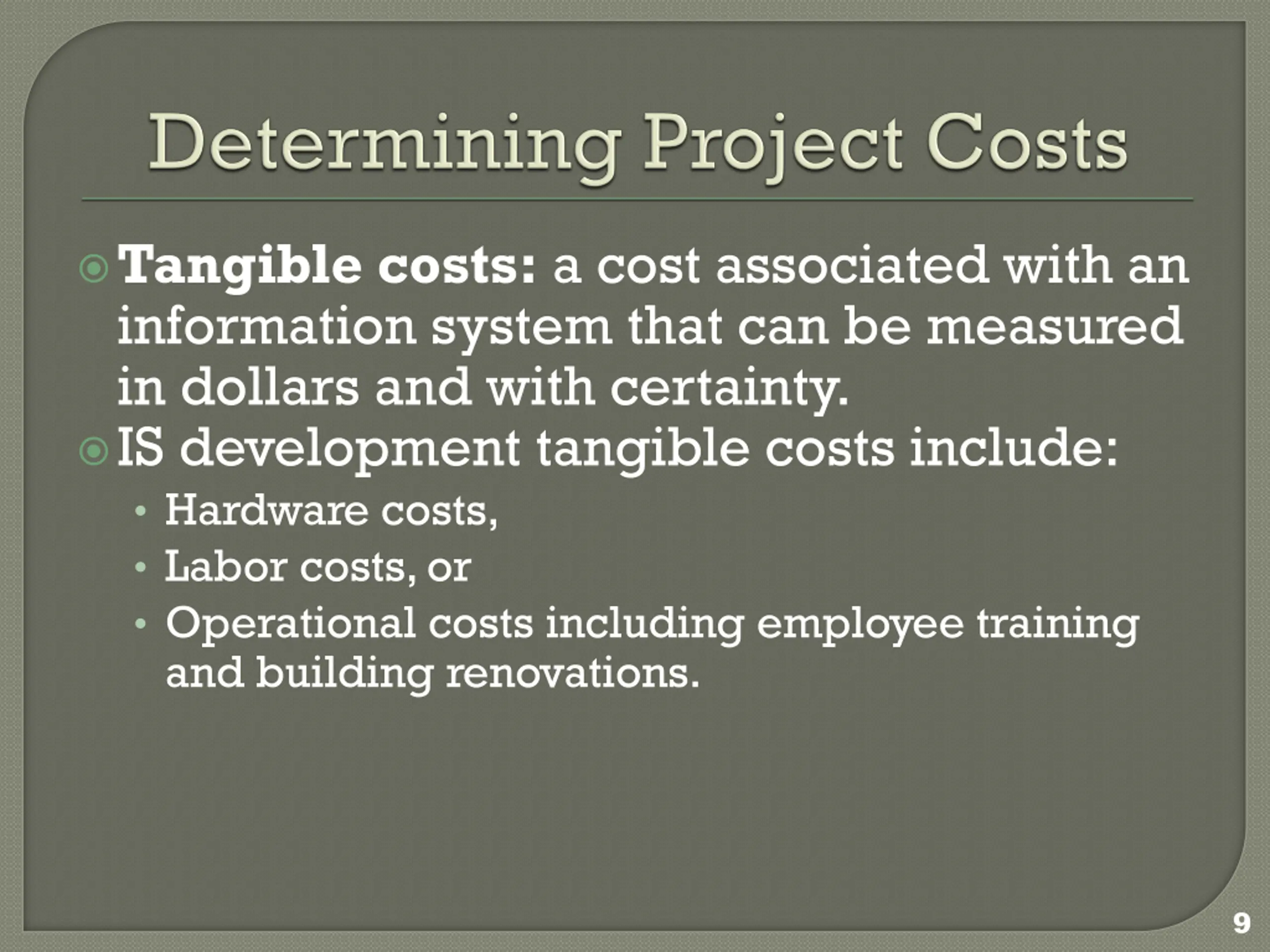 Tangible costs: a cost associated with an information system that can be measured in dollars and with certainty. IS development tangible costs include: Hardware costs, Labor costs, or Operational costs including employee training and building renovations. 9